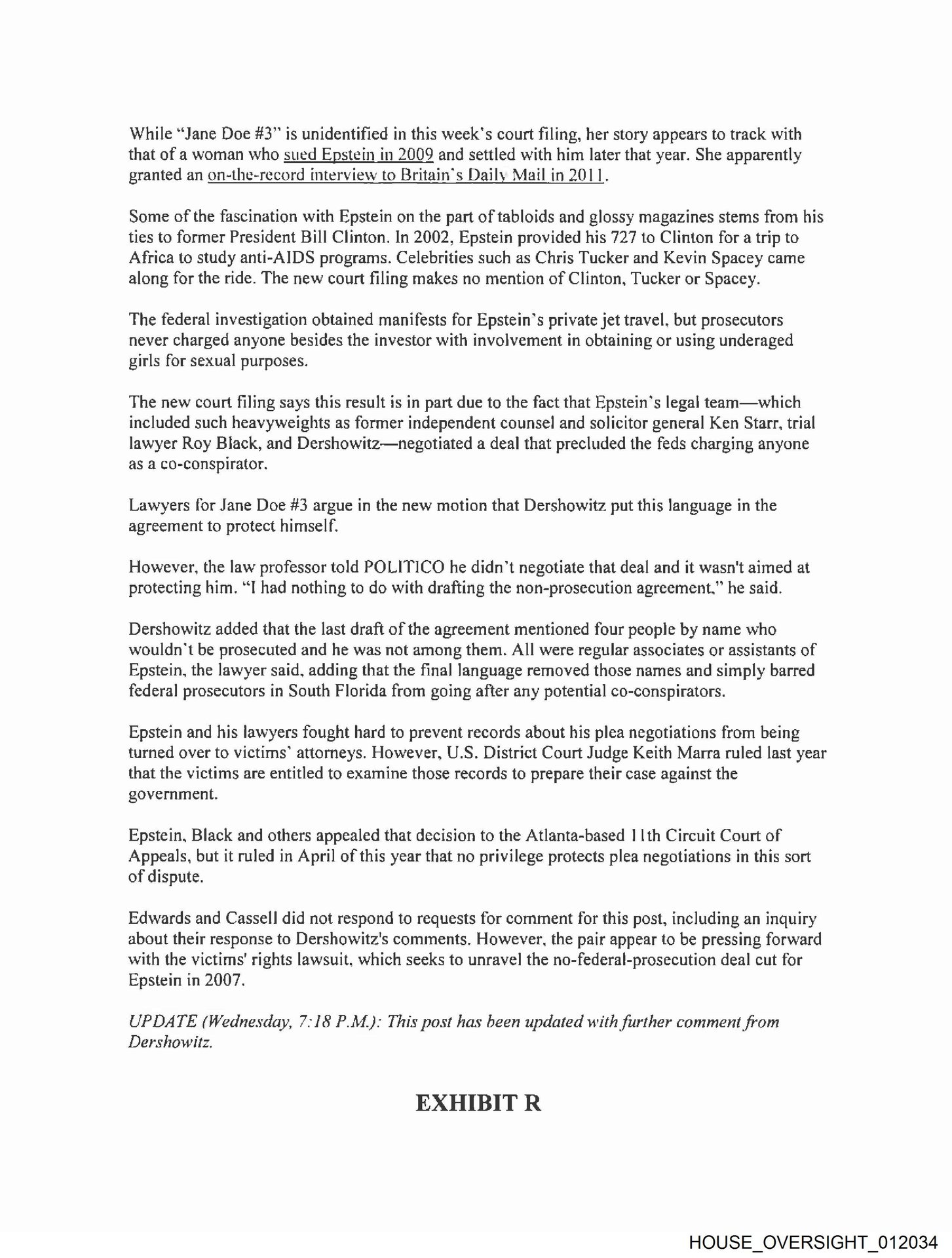 - HOUSE_OVERSIGHT_012034… independent counsel and solicitor general Ken Starr, trial lawyer Roy Black, and Dershowitz—negotiated a deal that precluded the feds charging anyone …