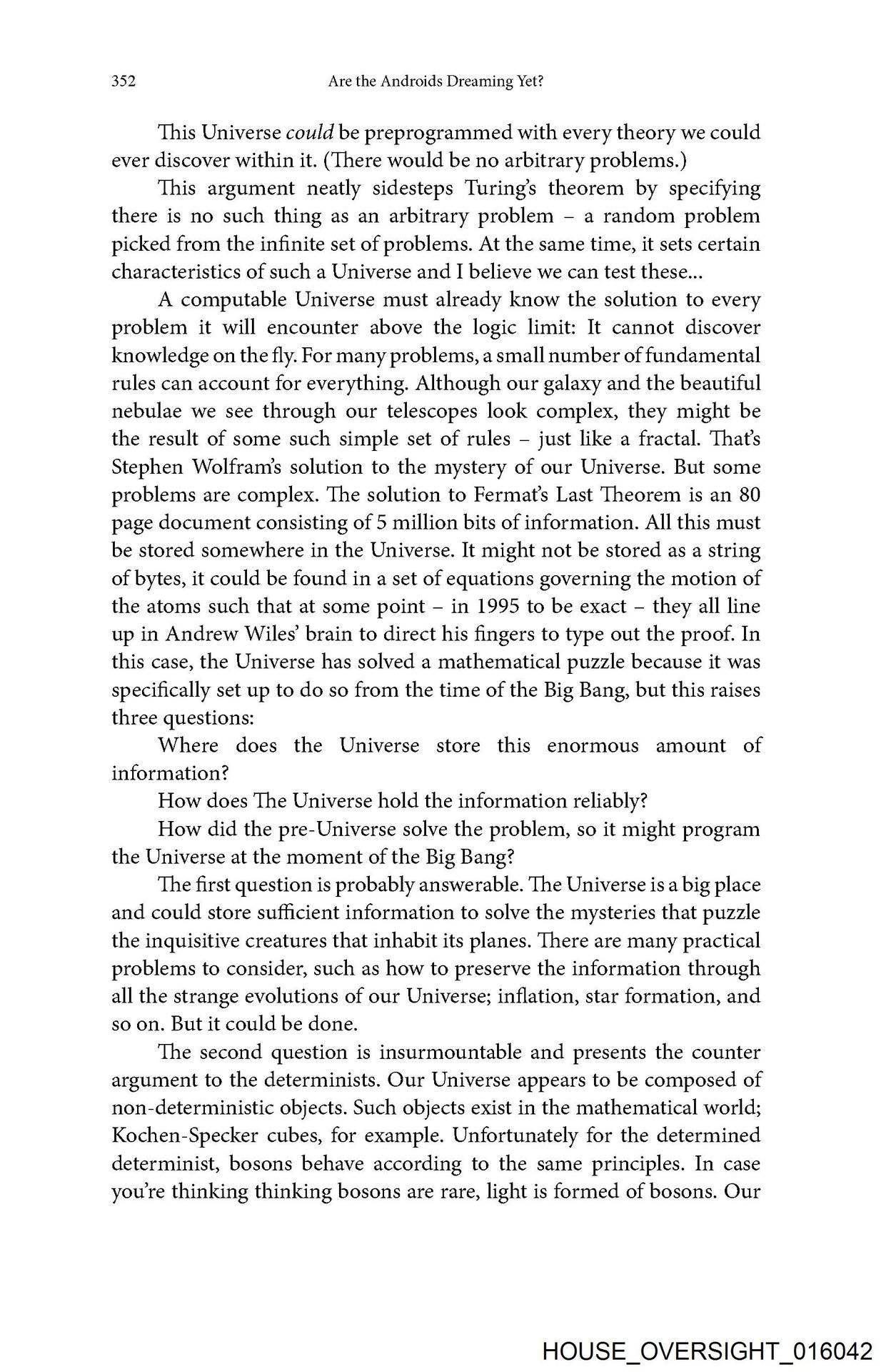 - HOUSE_OVERSIGHT_016042… non-deterministic objects. Such objects exist in the mathematical world; Kochen-Specker cubes, for example. Unfortunately for the determined determinist, bosons behave according …