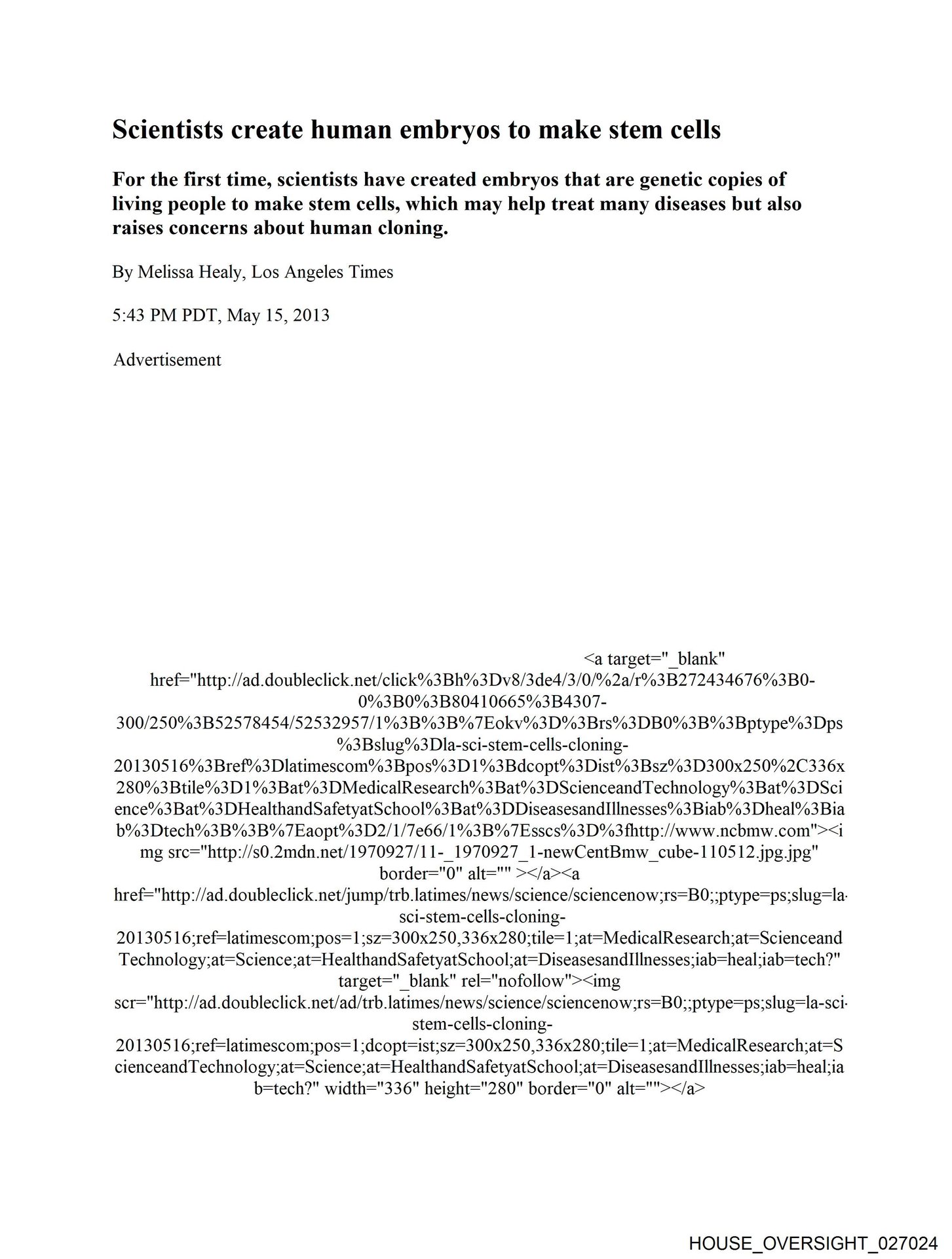 - HOUSE_OVERSIGHT_027024… Bat%3 DScienceandTechnology%3Bat%3DSci ence%3Bat%3DHealthandSafetyatSchool%3 Bat%3 DDiseasesandIllnesses%3 Biab%3 Dheal%3Bia b%3Dtech%3B%3B%7Eaopt%3D2/1/7e66/1%3B%7Esscs%3D%3 fhttp://www.ncbmw.com"><i mg sre="http://s0.2mdn.net/1970927/11-_1970927_1-newCentBmw_cube-110512.jpg.jpg" border="0" alt="" ></a><a href="http://ad.doubleclick.net/jump/trb.latimes/news/science/sciencenow;rs=BO0;;ptype=ps;slug=la- sci-stem-cells-cloning- 201305 16;ref=latimescom;pos=1 ;sz=300×250,336×280;tile=1 ;at=MedicalResearch;at=Scienceand Technology;at=Science;at=HealthandSafetyatSchool;at=DiseasesandIllnesses;iab=heal;iab=tech?" …