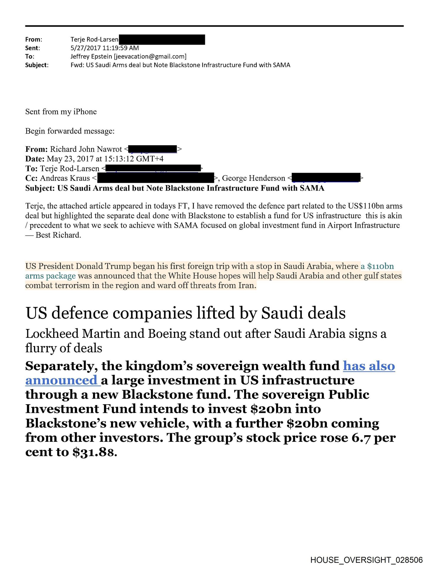 - HOUSE_OVERSIGHT_028506… Epstein [jeeyacation@gmail.com] Subject: Fwd: US Saudi Arms deal but Note Blackstone Infrastructure Fund with SAMA Sent from my iPhone Begin forwarded …