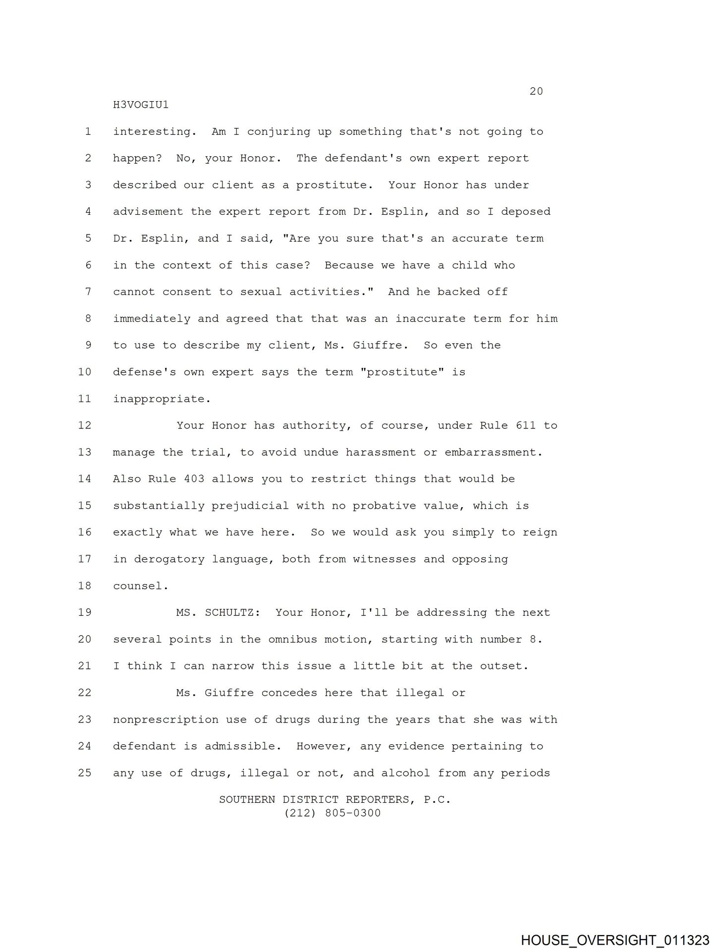 - HOUSE_OVERSIGHT_011323… we would ask you simply to reign a in derogatory language, both from witnesses and opposing 18 counsel. 19 MS. SCHULTZ: …