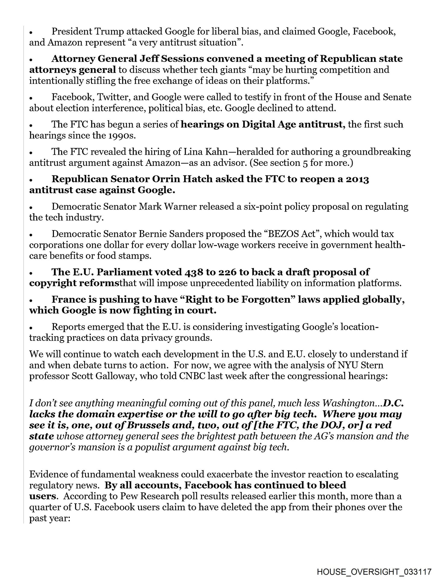 - HOUSE_OVERSIGHT_033117… President Trump attacked Google for liberal bias, and claimed Google, Facebook, and Amazon represent "a very antitrust situation". • Attorney General …