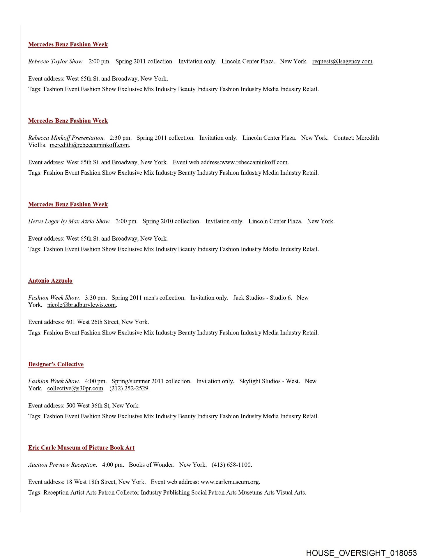 - HOUSE_OVERSIGHT_018055… pm. Spring 2010 collection. Invitation only. Milk Gallery-Studios. New York. julissa@bradburylewis.com. Event address: 450 West 15th St., New York. Tags: Fashion …