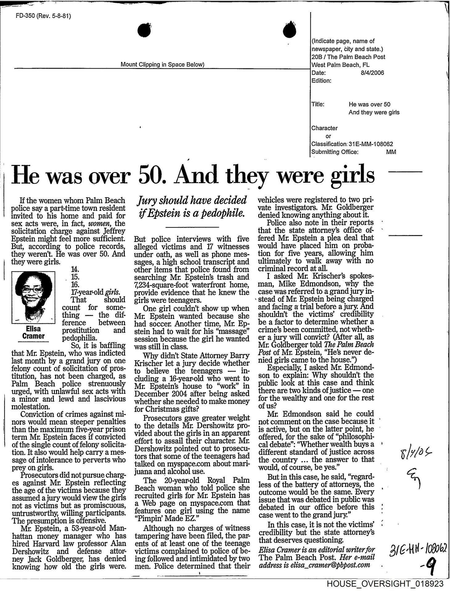 - HOUSE_OVERSIGHT_030299… #1 He was over 50. And they were girls By Elisa Cramer HASH(Ox5fa474) Friday, August 04, 2006 If the women whom …