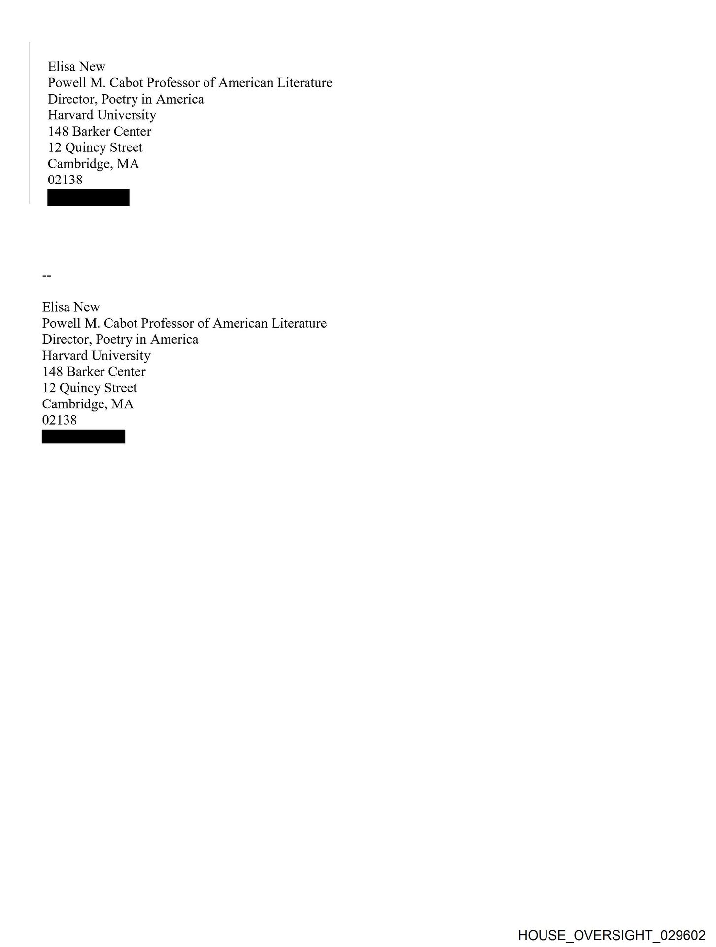 - HOUSE_OVERSIGHT_029580Elisa New Powell M. Cabot Professor of American Literature Director, Poetry …