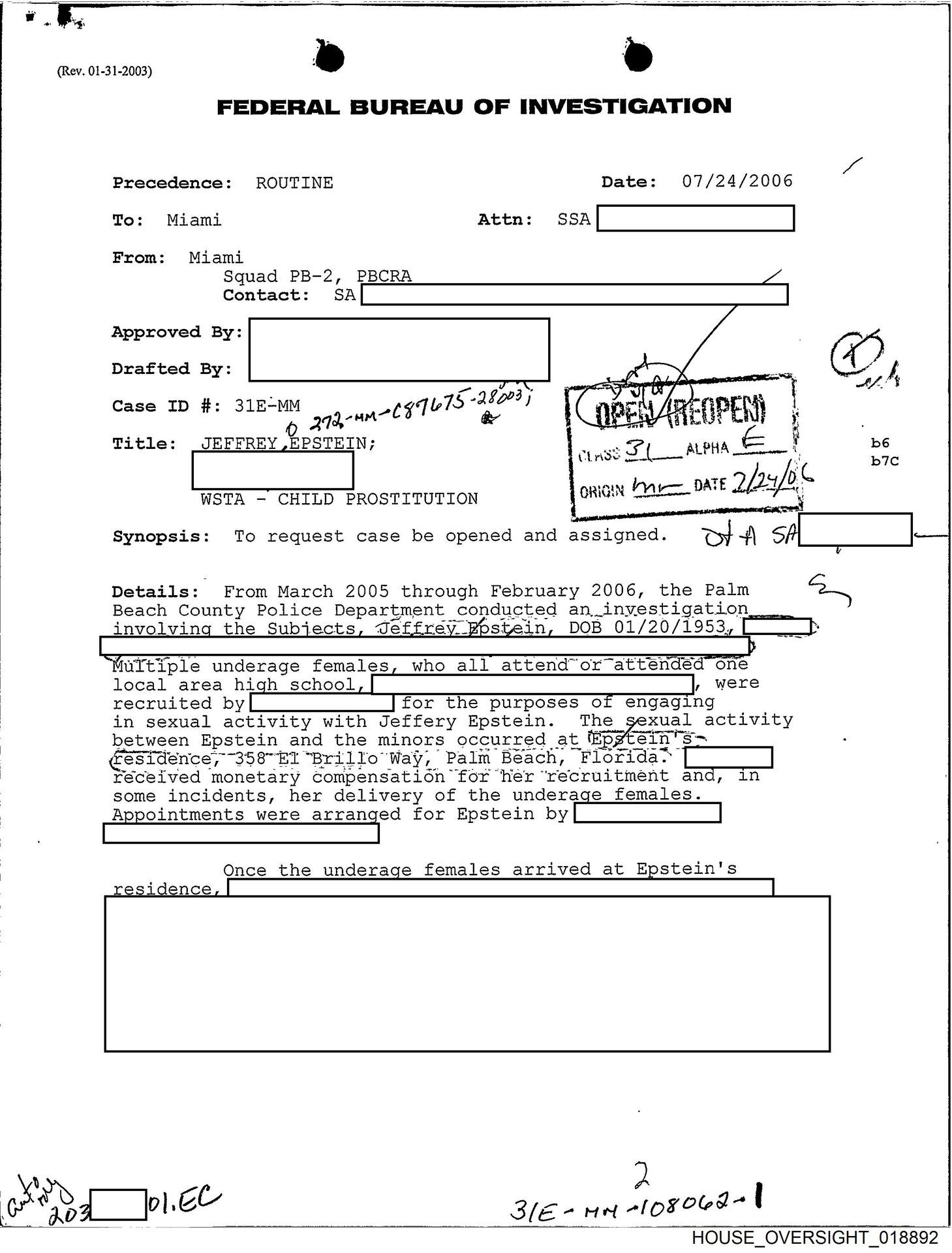 - HOUSE_OVERSIGHT_030308… in late July. The police started investigating Mr. Epstein in March 2005, almost immediately after they were contacted by the stepmother …