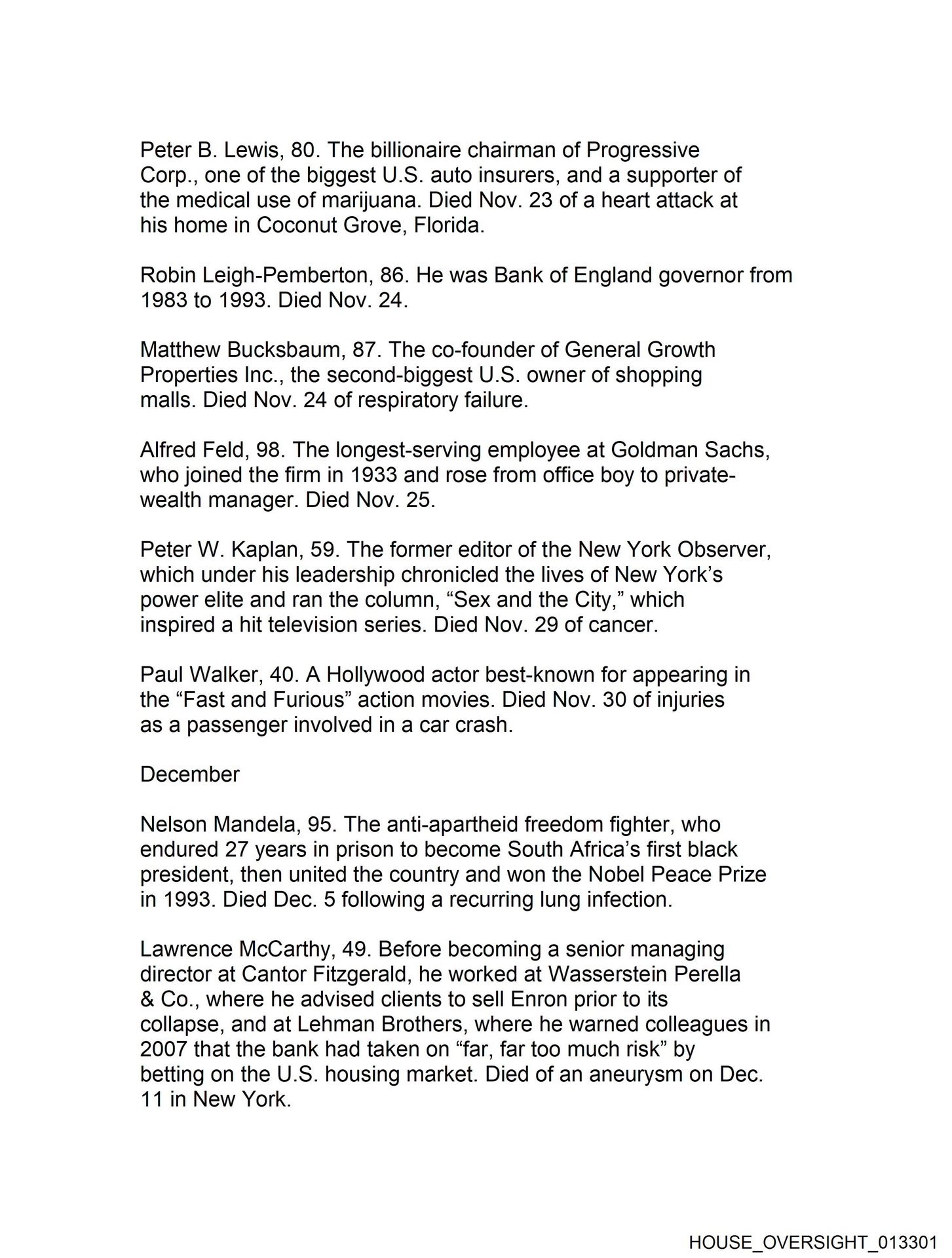 - HOUSE_OVERSIGHT_013301… of England governor from 1983 to 1993. Died Nov. 24. Matthew Bucksbaum, 87. The co-founder of General Growth Properties Inc., the …