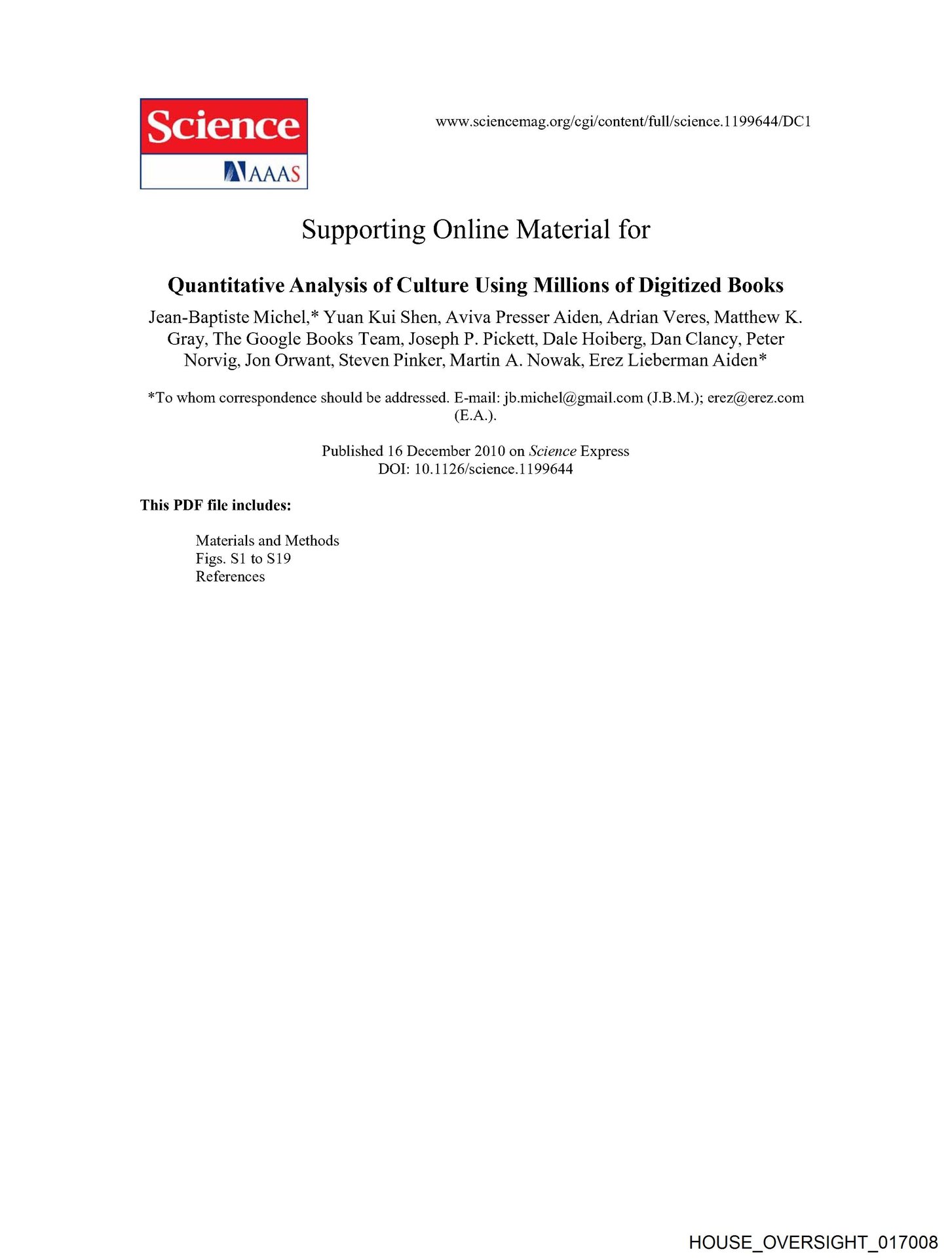 - HOUSE_OVERSIGHT_017008… Jean-Baptiste Michel,* Yuan Kui Shen, Aviva Presser Aiden, Adrian Veres, Matthew K. Gray, The Google Books Team, Joseph P. Pickett, Dale …