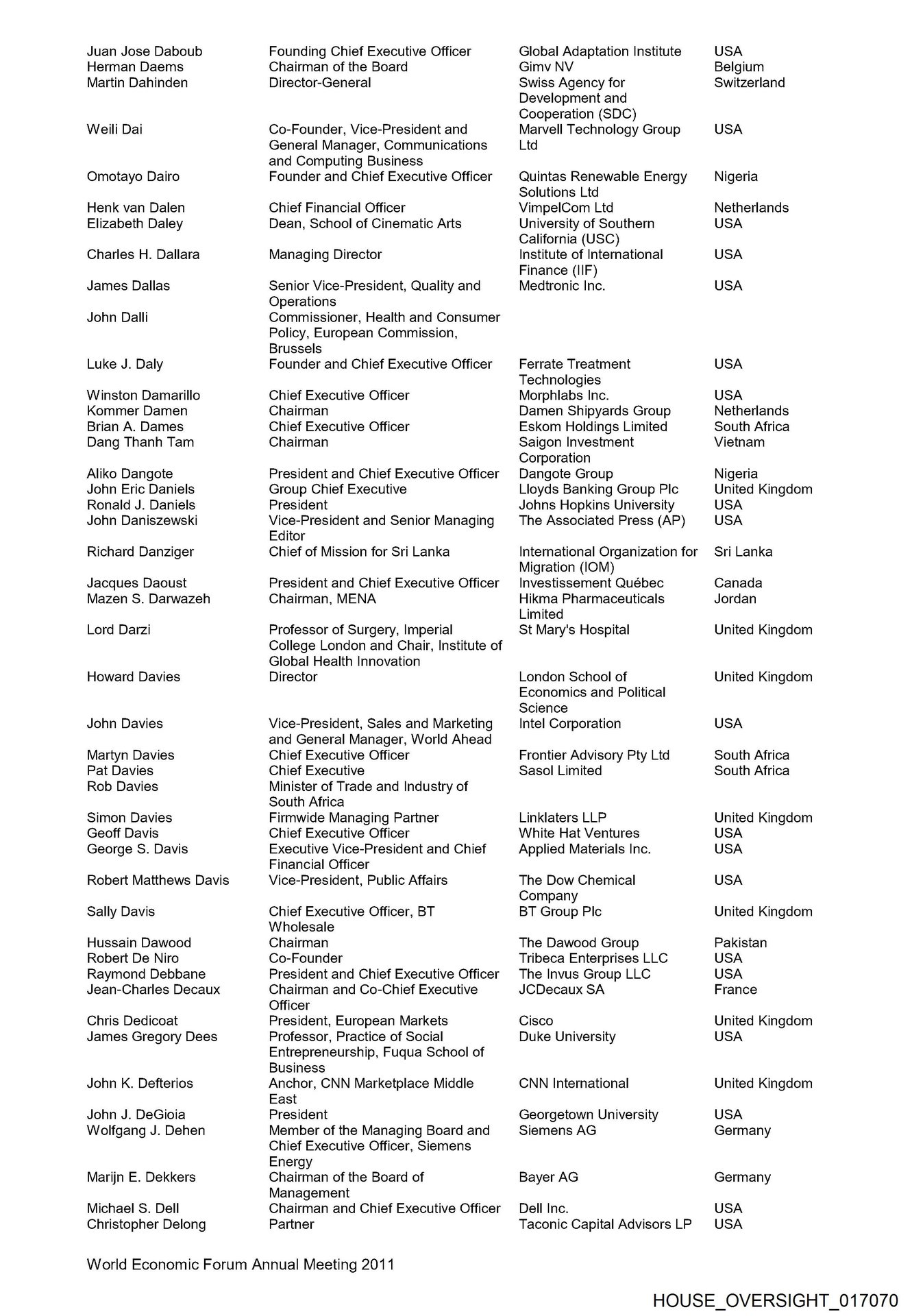- HOUSE_OVERSIGHT_017070… Vice-President and Chief Applied Materials Inc. USA Financial Officer Robert Matthews Davis Vice-President, Public Affairs The Dow Chemical USA Company Sally …