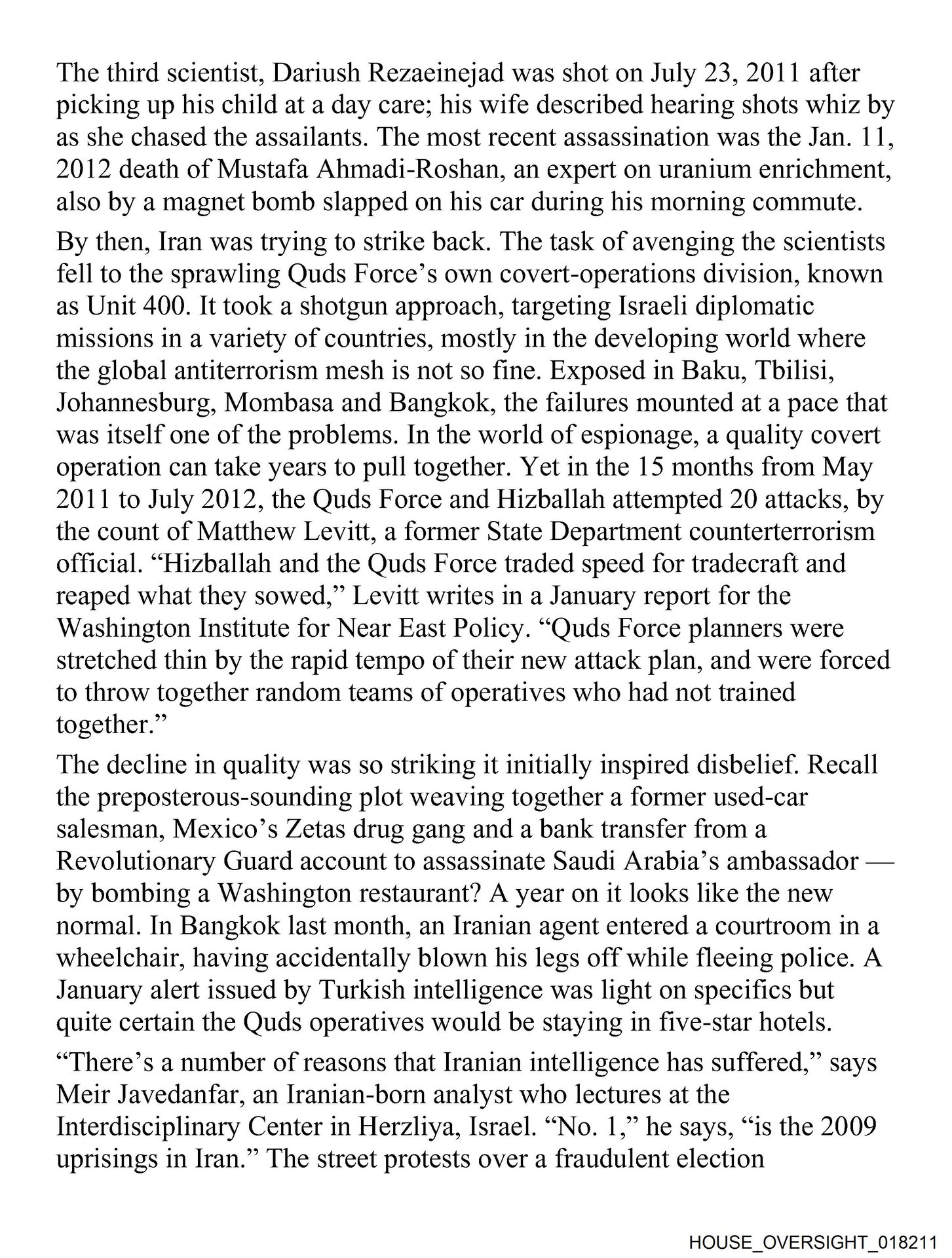 - HOUSE_OVERSIGHT_018211… Force and Hizballah attempted 20 attacks, by the count of Matthew Levitt, a former State Department counterterrorism official. "Hizballah and the …