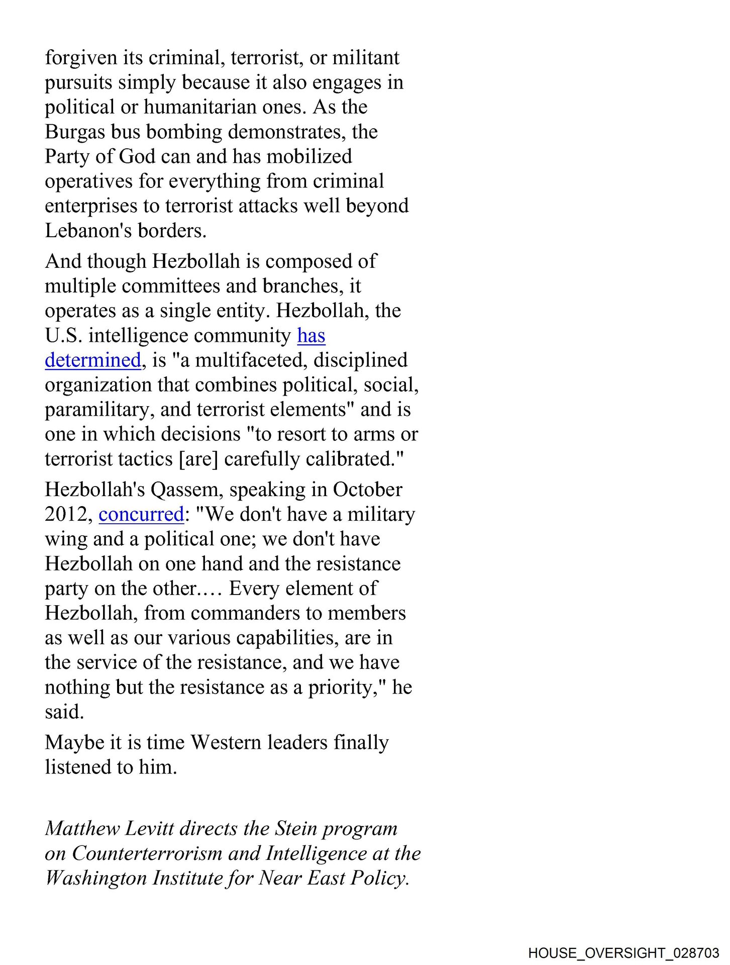 - HOUSE_OVERSIGHT_028703… Maybe it is time Western leaders finally listened to him. Matthew Levitt directs the Stein program on Counterterrorism and Intelligence at …
