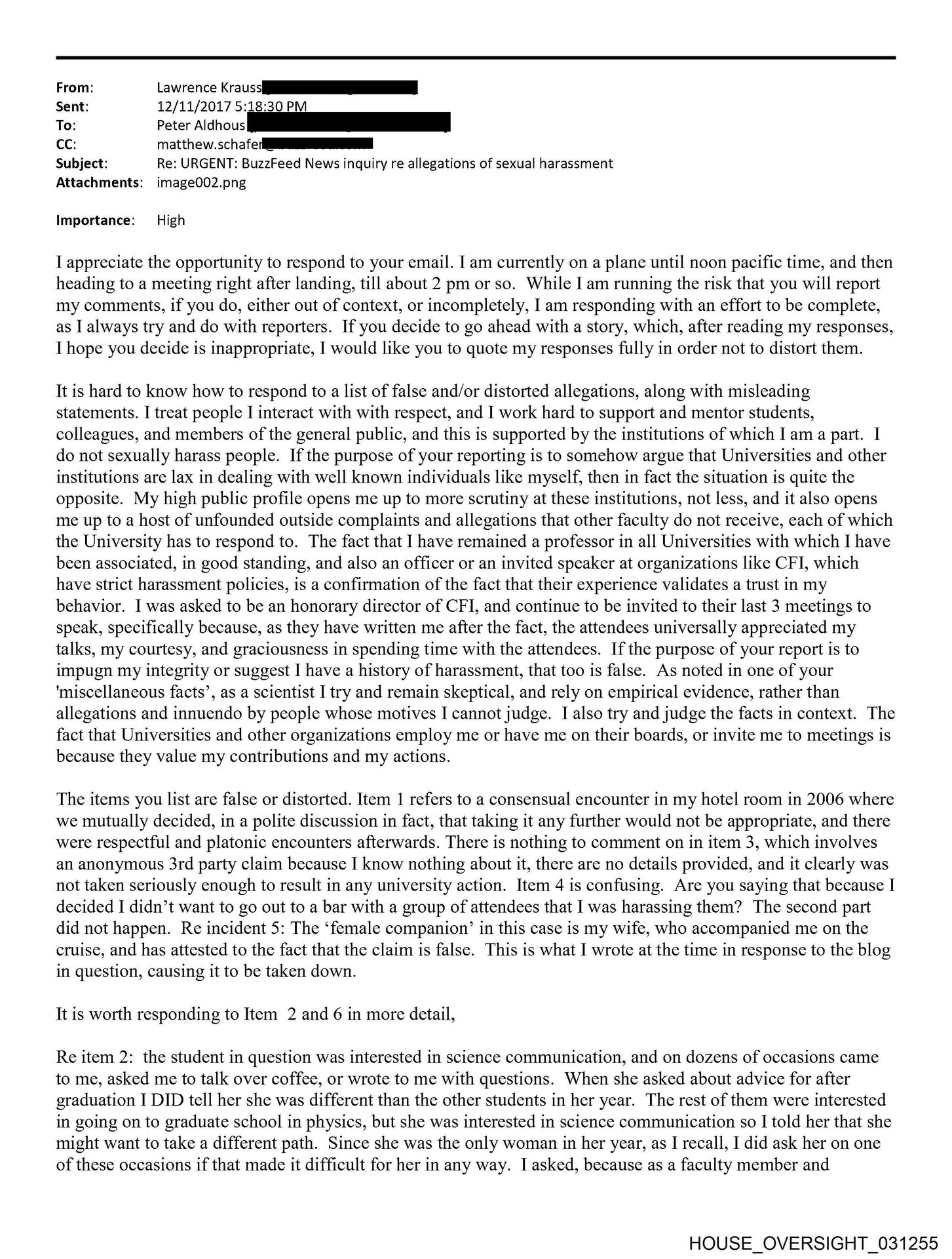 - HOUSE_OVERSIGHT_031255… Lawrence Krauss Sent: 12/11/2017 5:18:30 PM To: Peter Aldhousl CC: matthew.schafe Subject: Re: URGENT: BuzzFeed News inquiry re allegations of sexual …