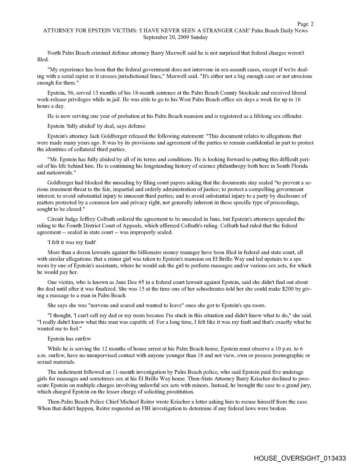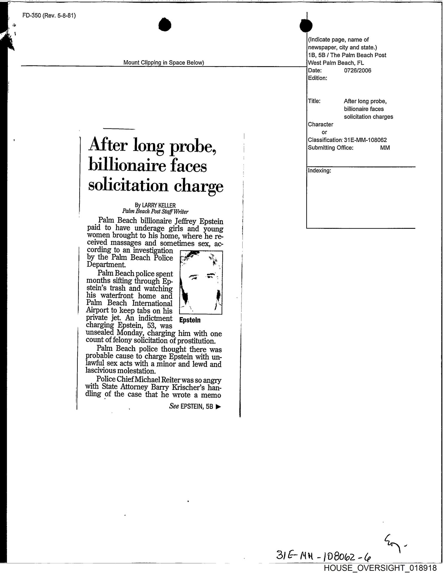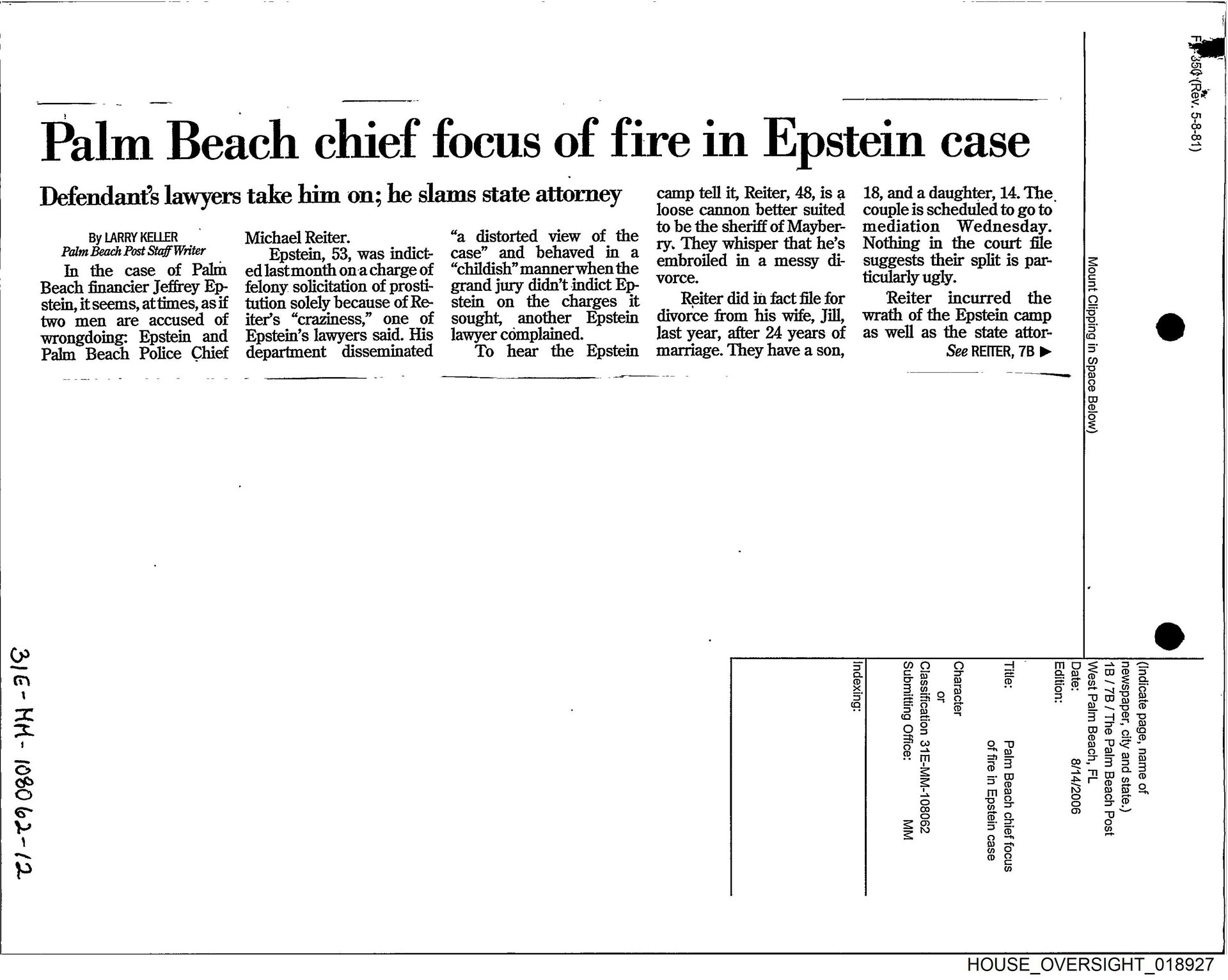 - HOUSE_OVERSIGHT_029626… article quoted a deposition by then-Palm Beach Chief of Police Michael Reiter, in which he stated that Epstein, a billionaire with …