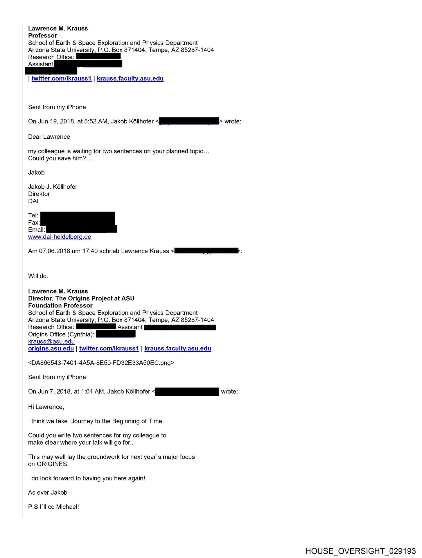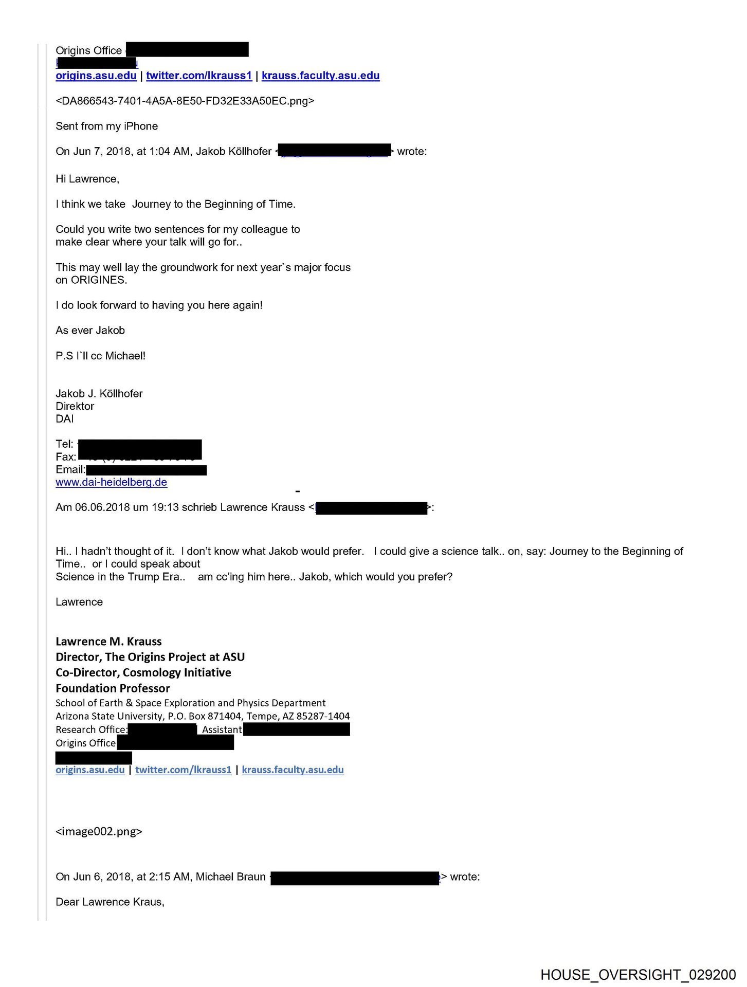 - HOUSE_OVERSIGHT_029184On Jun 6, 2018, at 2:15 AM, Michael Braun <____________________________________ wrote: Dear Lawrence Kraus, my name is Michael …
