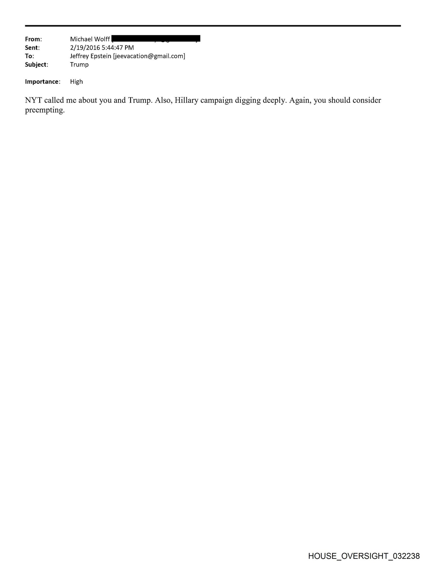 - HOUSE_OVERSIGHT_033291From: Michael Wolff Sent: 4/29/2016 4:41:30 PM To: Jeffrey Epstein [jeeyacation@gmail.com] Subject: …