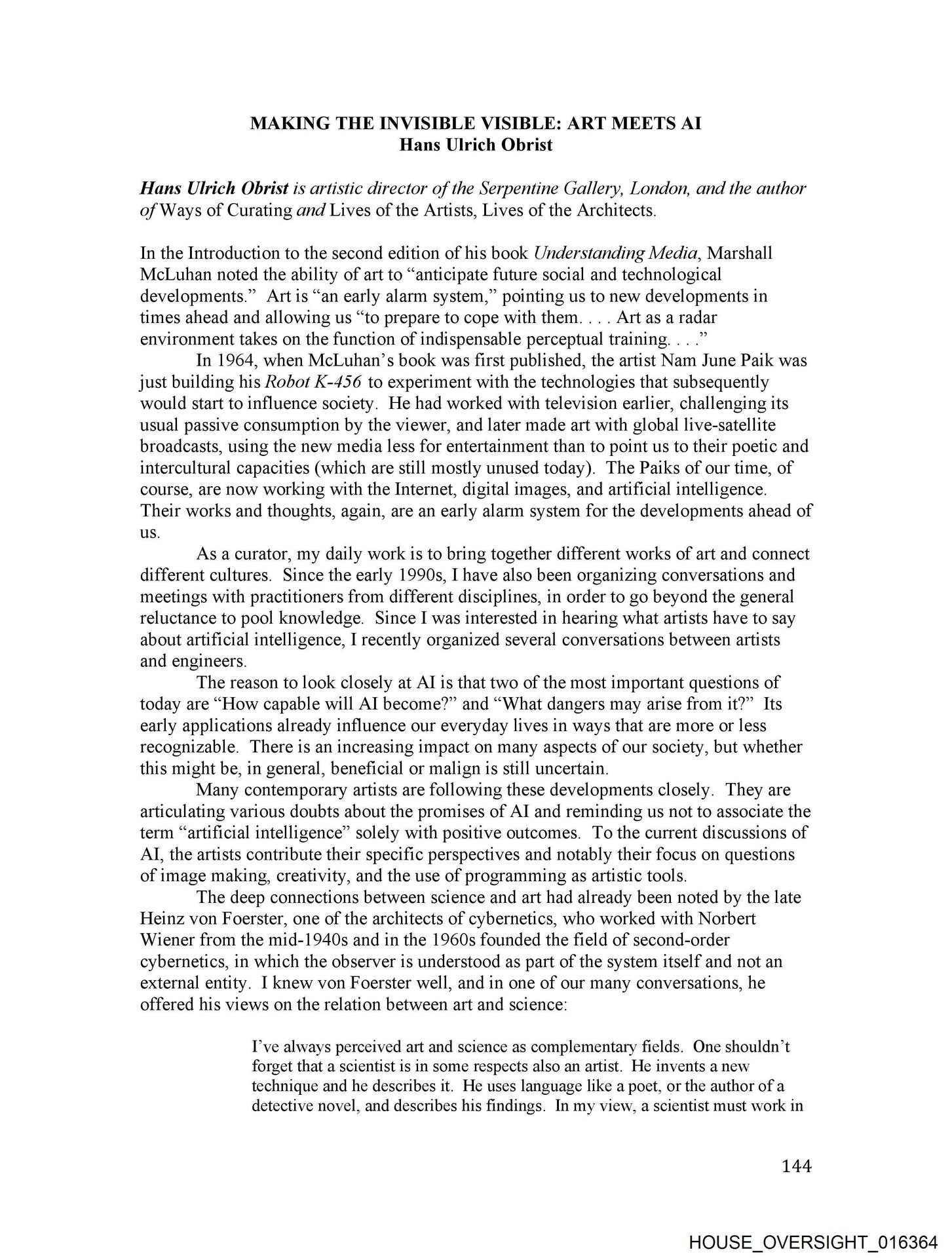 - HOUSE_OVERSIGHT_016228… face of an emerging unprecedented diversity of minds. Caroline A. Jones: The Artistic Use of Cybernetic Beings The work of cybernetically …