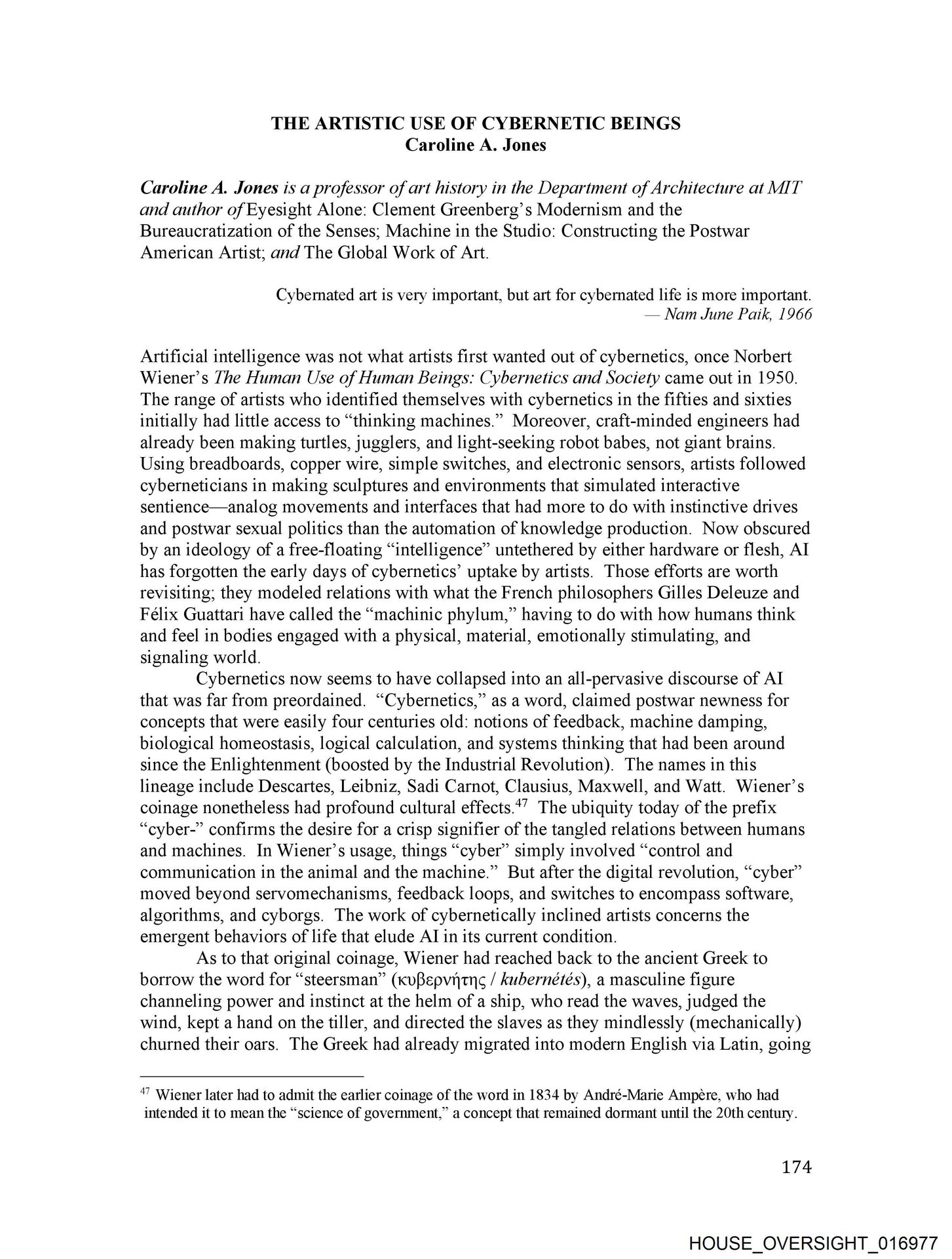- HOUSE_OVERSIGHT_016977THE ARTISTIC USE OF CYBERNETIC BEINGS Caroline A. Jones Caroline A. Jones is a professor of art history in …