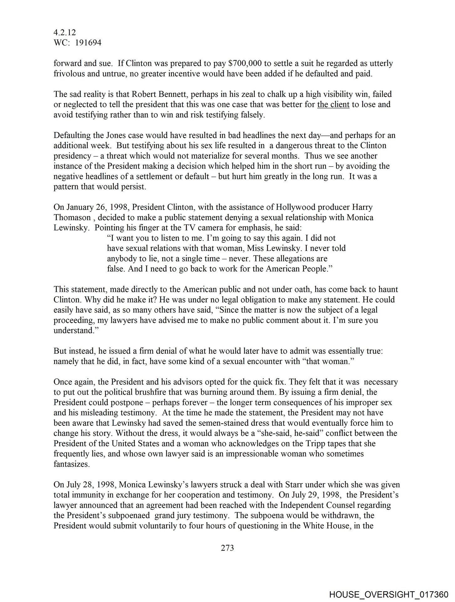 - HOUSE_OVERSIGHT_0173564.2.12 WC: 191694 then in place — the Jones lawsuit and the Kenneth Starr investigation. These legal proceedings escalated …