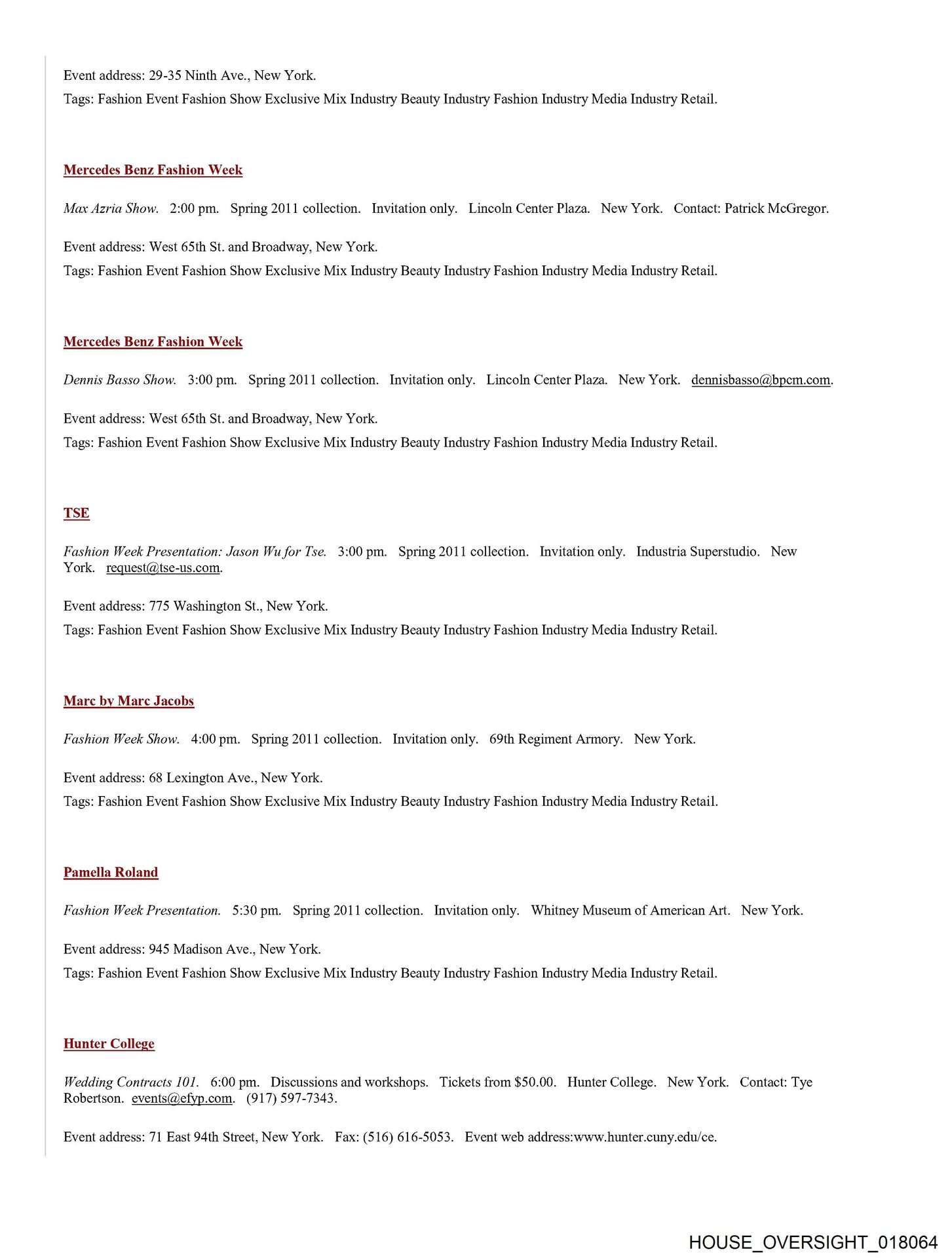 - HOUSE_OVERSIGHT_018064… 2011 collection. Invitation only. Lincoln Center Plaza. New York. Contact: Patrick McGregor. Event address: West 65th St. and Broadway, New York. …