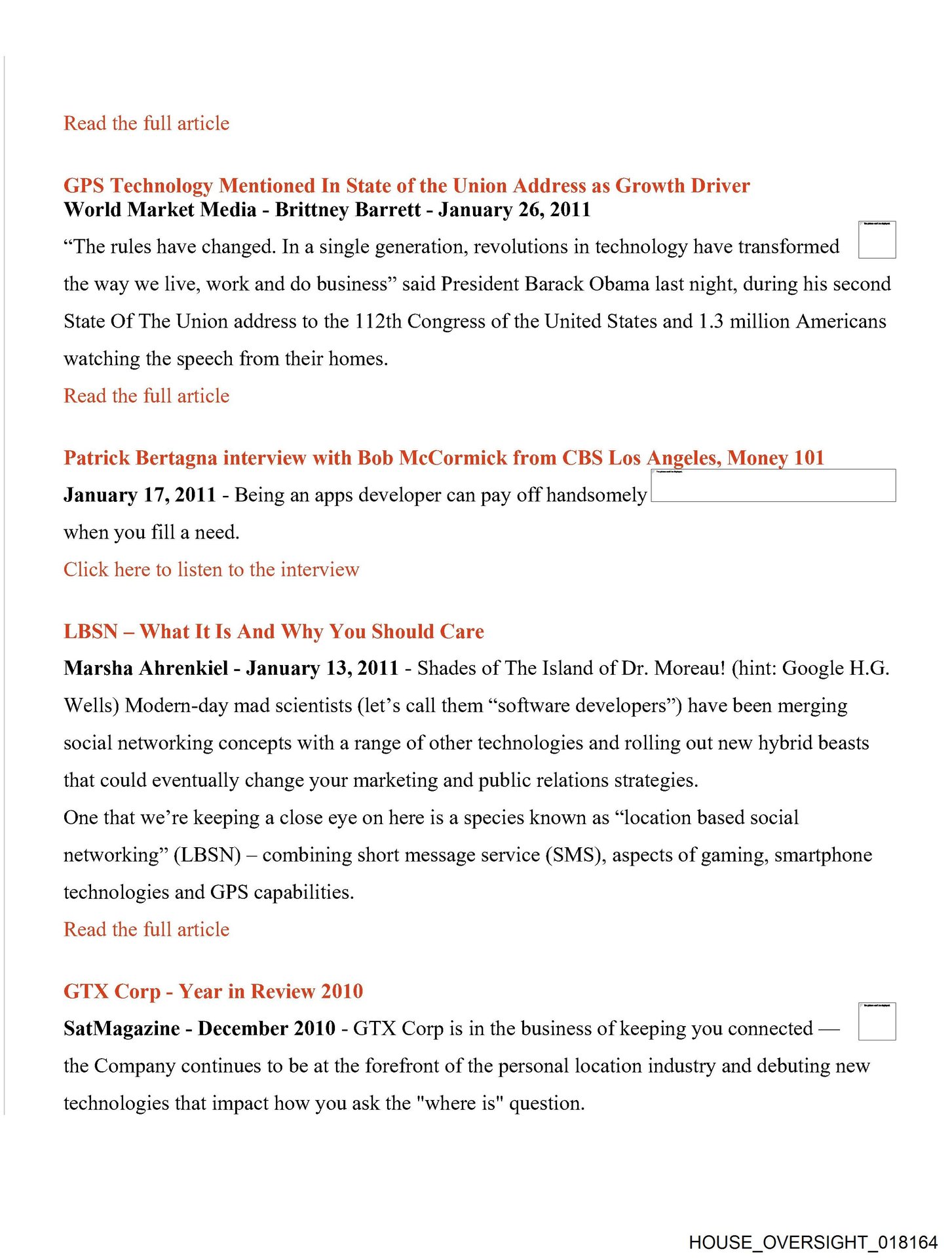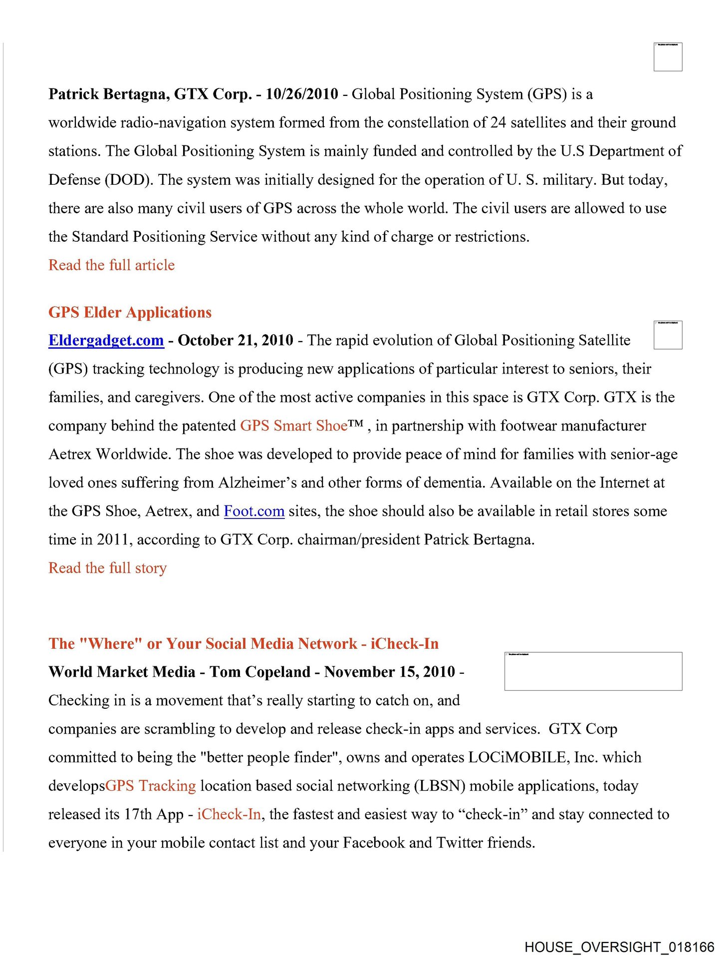 - HOUSE_OVERSIGHT_018166Patrick Bertagna, GTX Corp. – 10/26/2010 – Global Positioning System (GPS) …