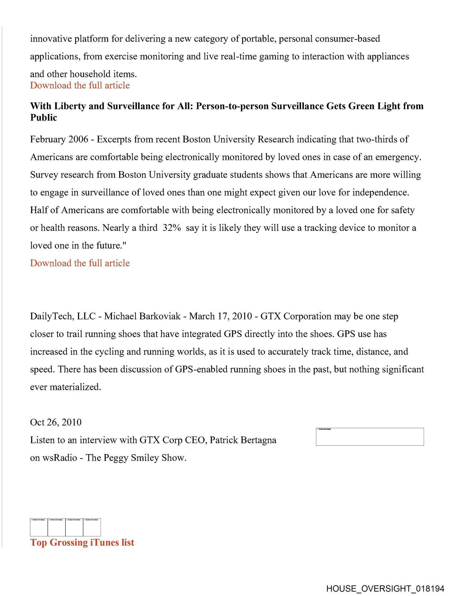 - HOUSE_OVERSIGHT_018185… system. During a recent visit to Portland, GTX Corp CEO Patrick Bertagna showed KGW a prototype of the company's GPS shoe. …