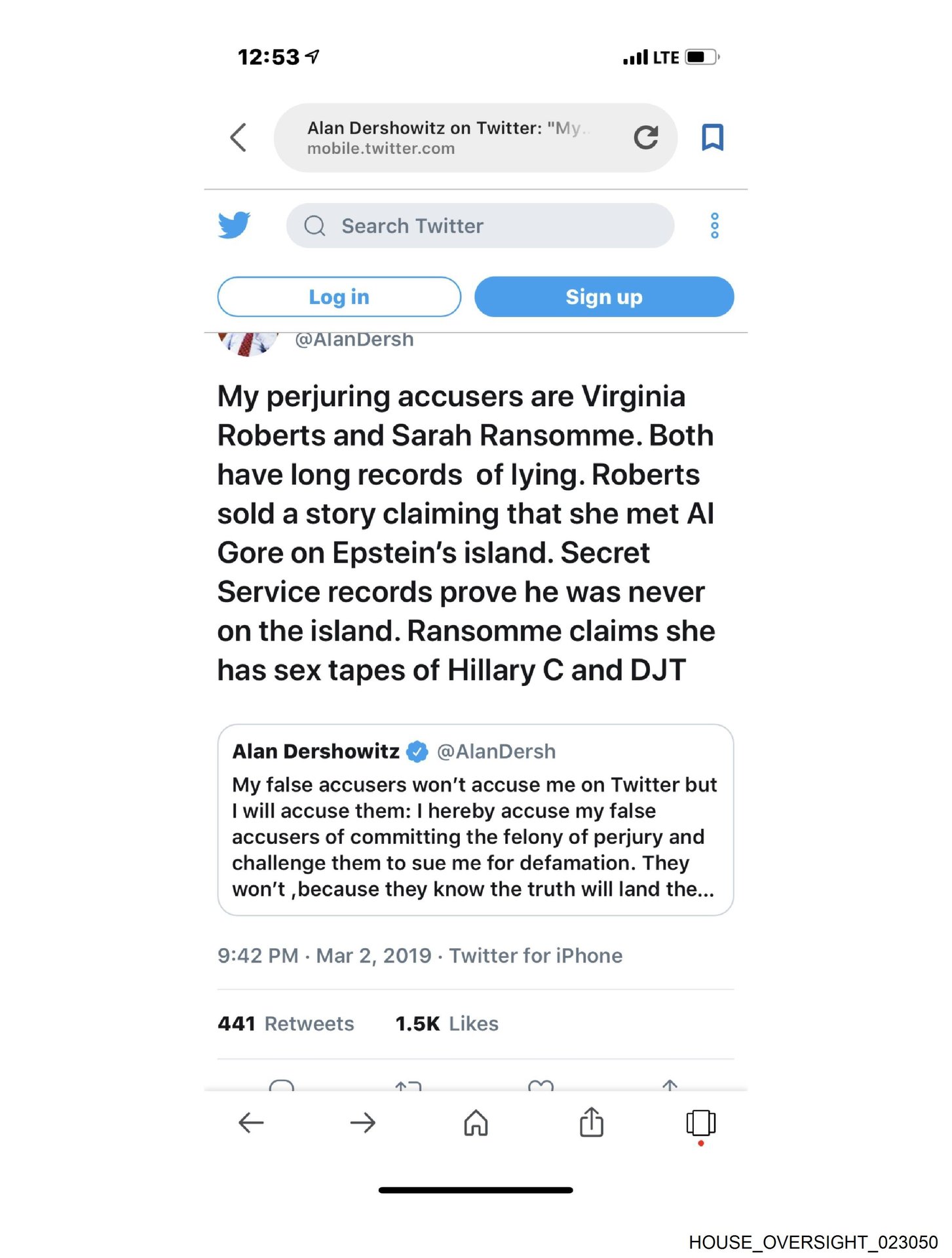 - HOUSE_OVERSIGHT_010784… THE WITNESS: Yes. 11 ALSO PRESENT: a Thereupon: 12 Joni Jones, Utah Attorney General Office 14 ALAN M. DERSHOWITZ 13 Travis …
