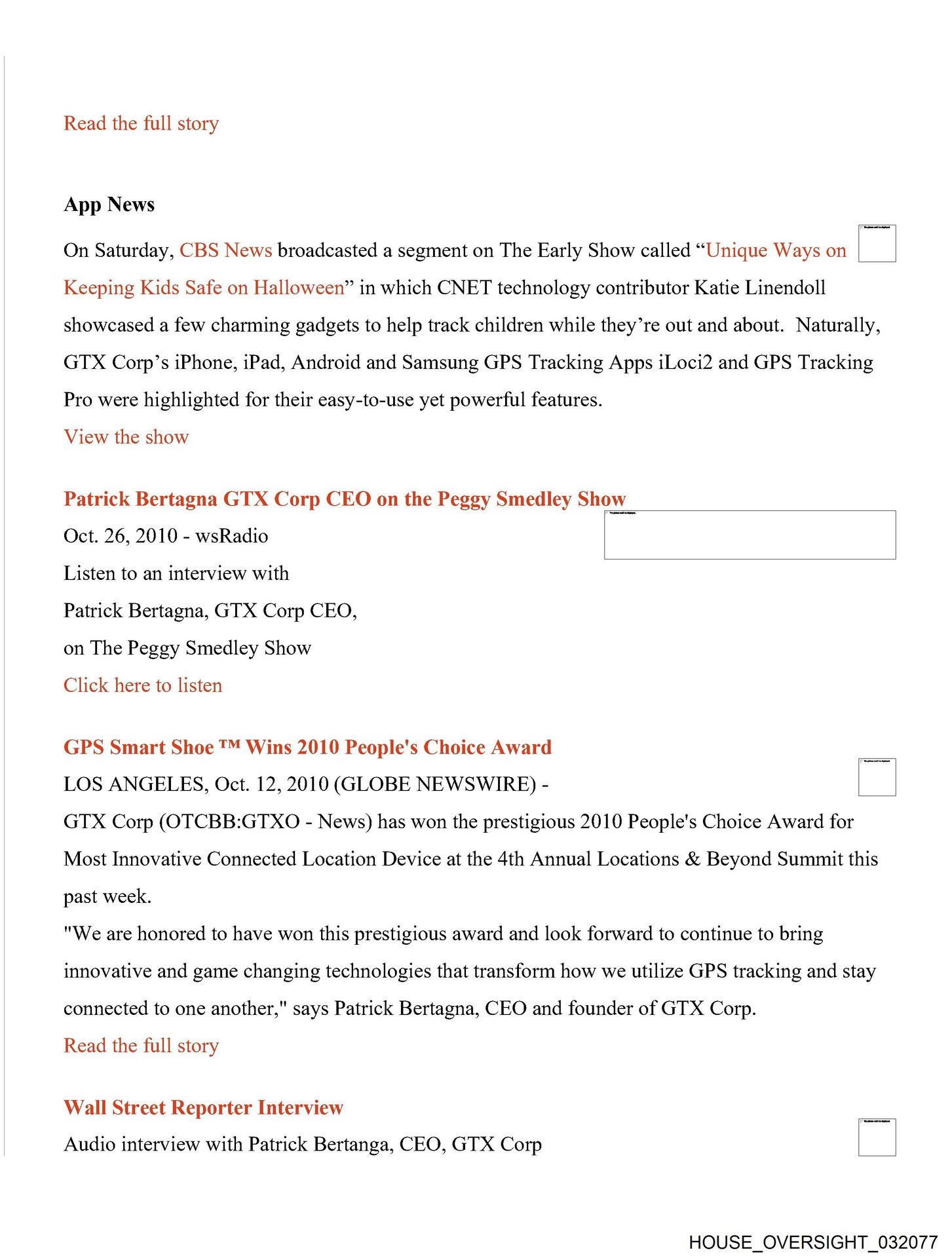 - HOUSE_OVERSIGHT_032068… Watch Video o GTX Corp on YouTube o Locimobile NEWS Patrick Bertagna Interviewed on Travel Talk Radio with Sandy Dhuyvetter ____ …