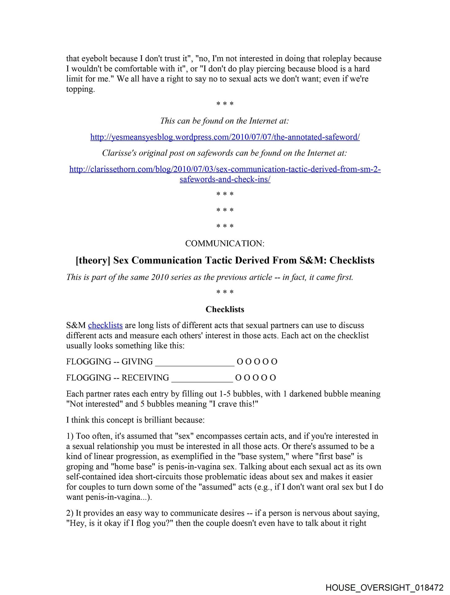 - HOUSE_OVERSIGHT_018472… post on safewords can be found on the Internet at: http://clarissethorn.com/blog/2010/07/03/sex-communication-tactic-derived-from-sm-2- safewords-and-check-ins/ OK OK OK OK OK COMMUNICATION: [theory] Sex Communication …