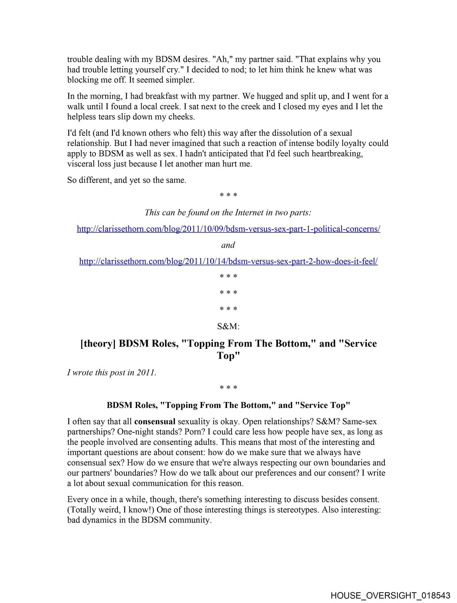 - HOUSE_OVERSIGHT_018543… This can be found on the Internet in two parts: http://clarissethom.com/blog/2011/10/09/bdsm-versus-sex-part-1-political-concerns/ and http://clarissethorn.com/blog/2011/10/14/bdsm-versus-sex-part-2-how-does-it-feel/ OK oR Re KK S&M: [theory] BDSM Roles, …