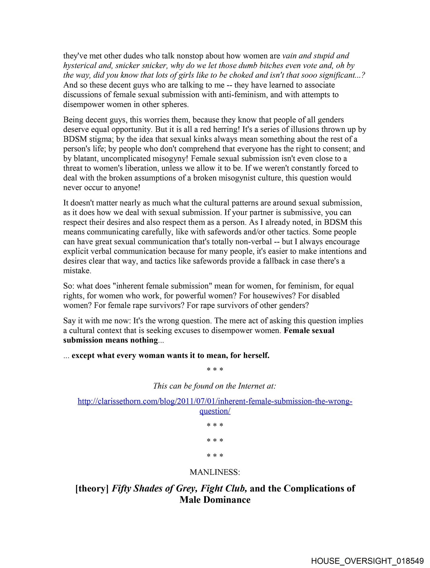 - HOUSE_OVERSIGHT_018549… OR OK This can be found on the Internet at: http://clarissethorn.com/blog/2011/07/01/inherent-female-submission-the-wrong- question/ OK OK OK OK oko MANLINESS: [theory] Fifty Shades …
