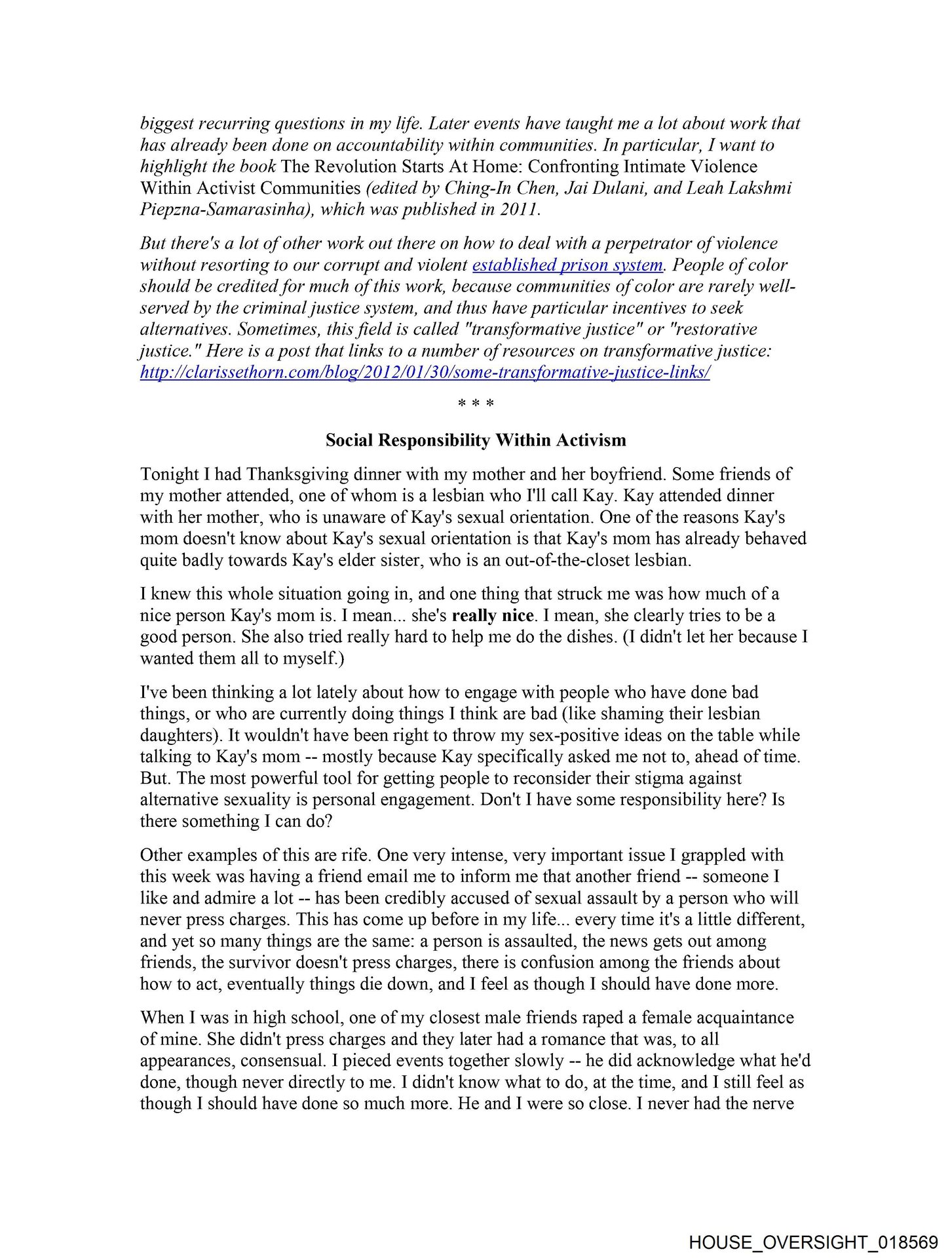 - HOUSE_OVERSIGHT_018569… that links to a number of resources on transformative justice: Attp://clarissethorn.com/blog/2012/01/30/some-transformative-justice-links/ OK Social Responsibility Within Activism Tonight I had Thanksgiving dinner …