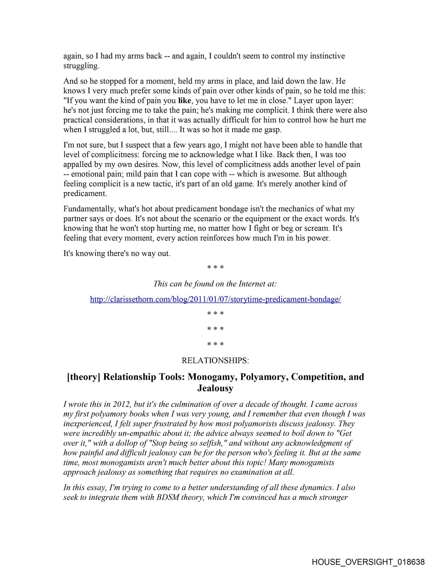 - HOUSE_OVERSIGHT_018638… OK OK This can be found on the Internet at: http://clarissethorn.com/blog/2011/01/07/storytime-predicament-bondage/ OOK xR xR RELATIONSHIPS: [theory] Relationship Tools: Monogamy, Polyamory, Competition, …