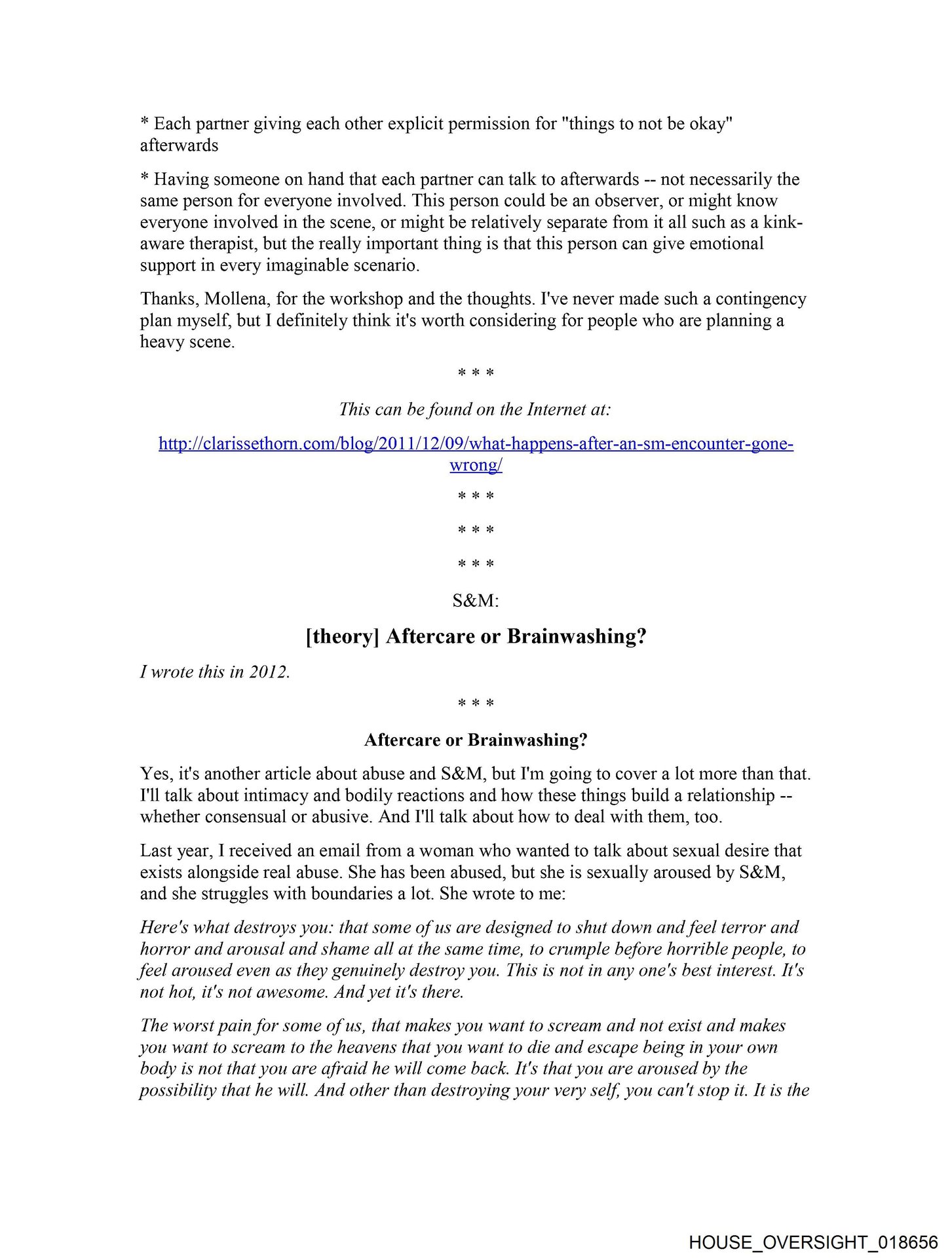 - HOUSE_OVERSIGHT_018663… 16, 2012, this can be found on the Internet at: http://clarissethorn.com/blog/2012/06/16/sm-aftercare-or-brainwashing xR oR RR oR RK COMMUNICATION: [theory] Feminist S&M Lessons …