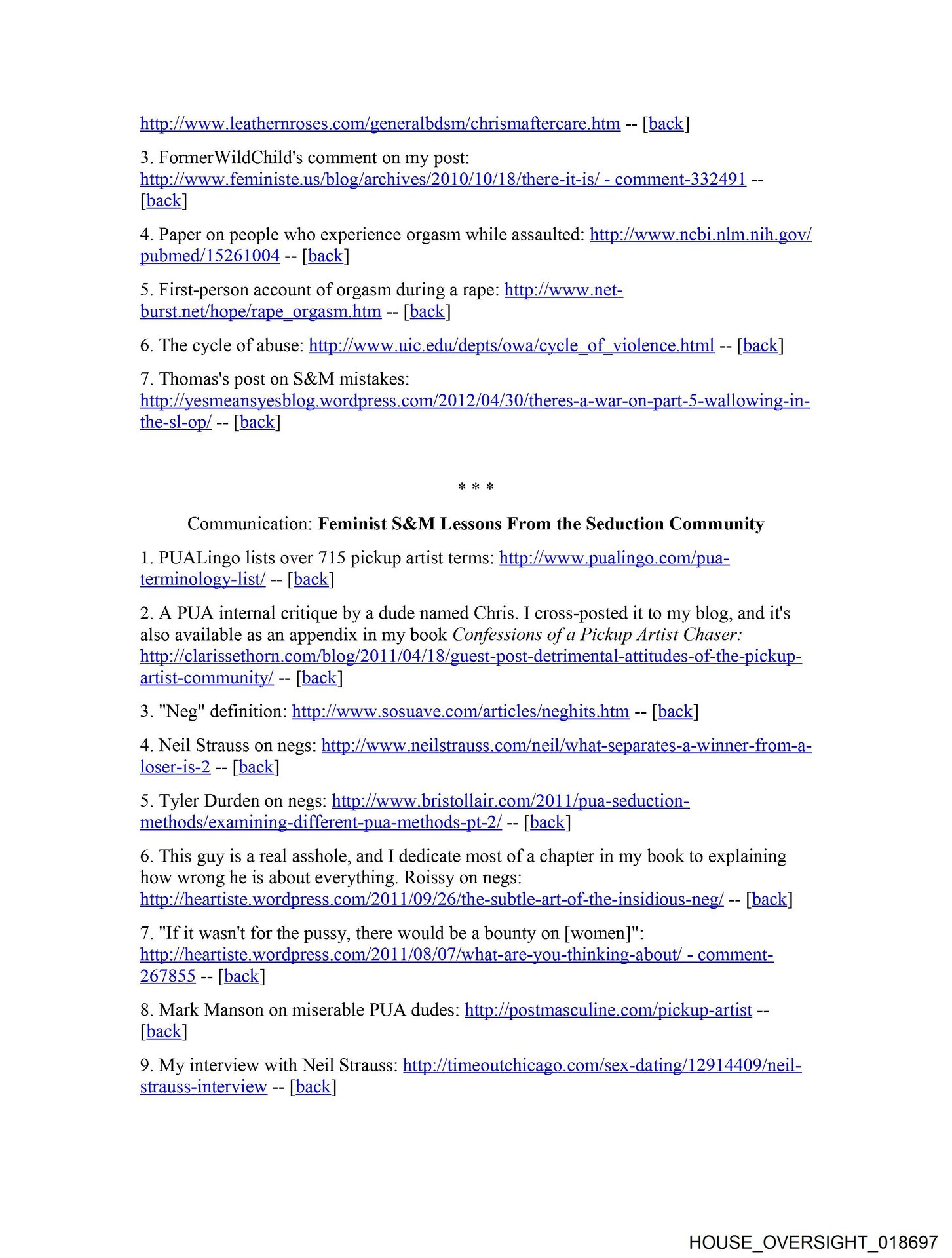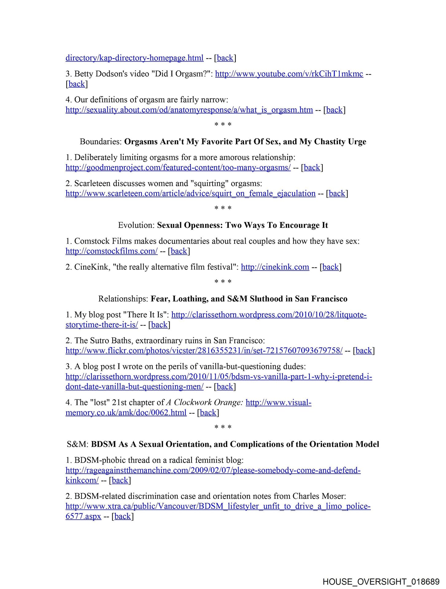 - HOUSE_OVERSIGHT_018690… — [back] 9. My old post "Casual Sex? Casual Kink?": http://clarissethorn.com/blog/2008/12/26/casual-sex-casual-kink/ — [back] 2K OK S&M: BDSM Roles, "Topping From The …