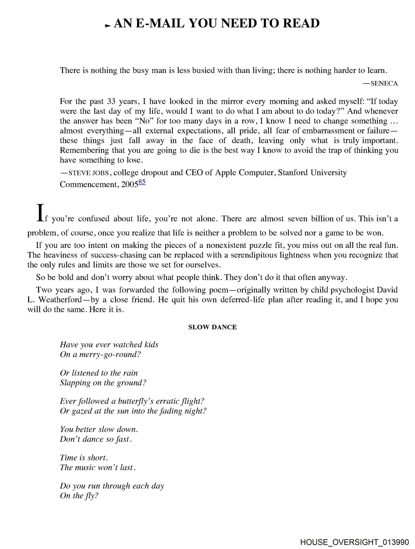 - HOUSE_OVERSIGHT_013990… avoid the trap of thinking you have something to lose. —STEVE JoBS, college dropout and CEO of Apple Computer, Stanford University …