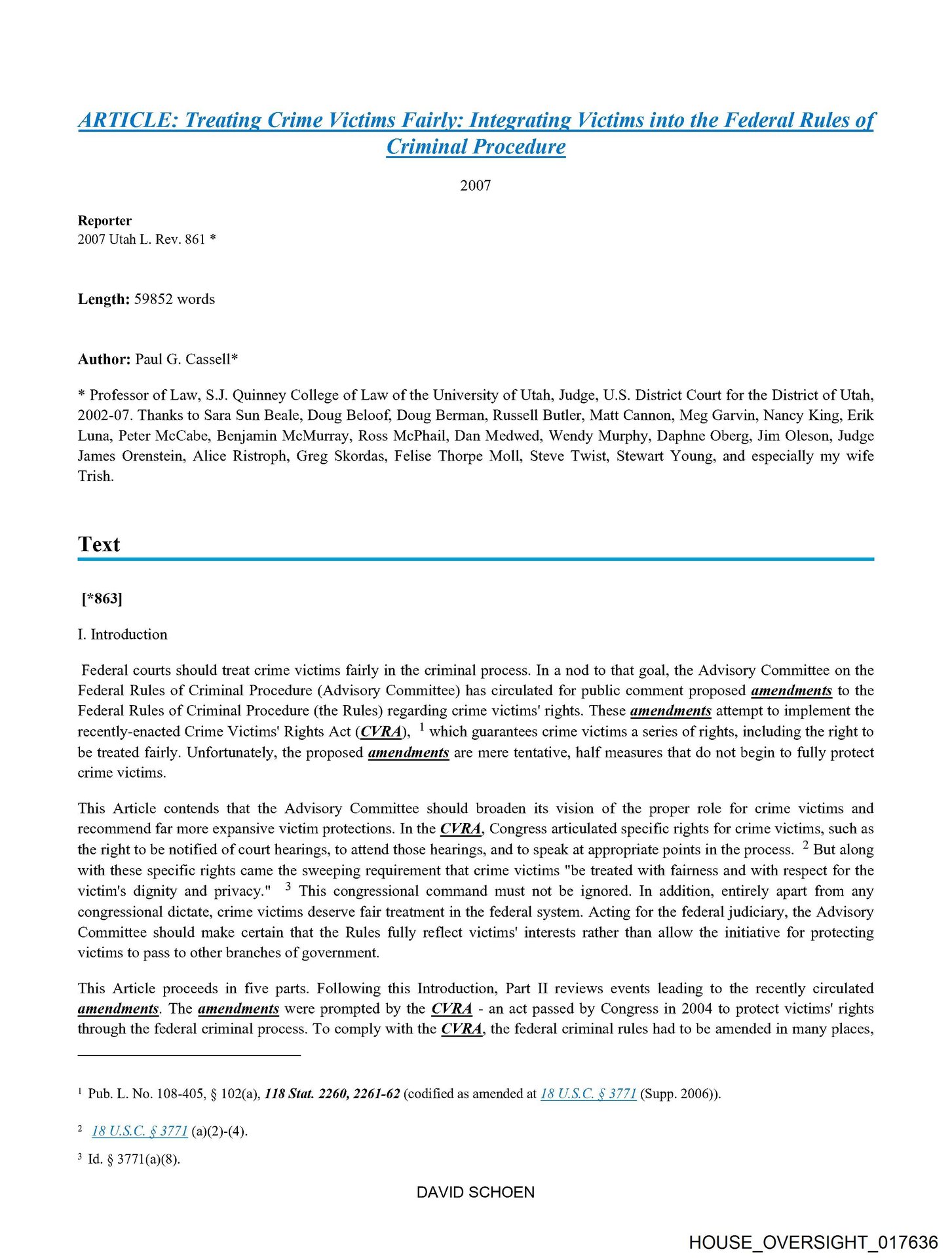 - HOUSE_OVERSIGHT_014042… through ® See DouGLas E. BELOor, PAUL G. CASSELL & STEVEN J. Twist, VICTIMS IN CRIMINAL PROCEDURE 3-39 (3d ed. 2010) …