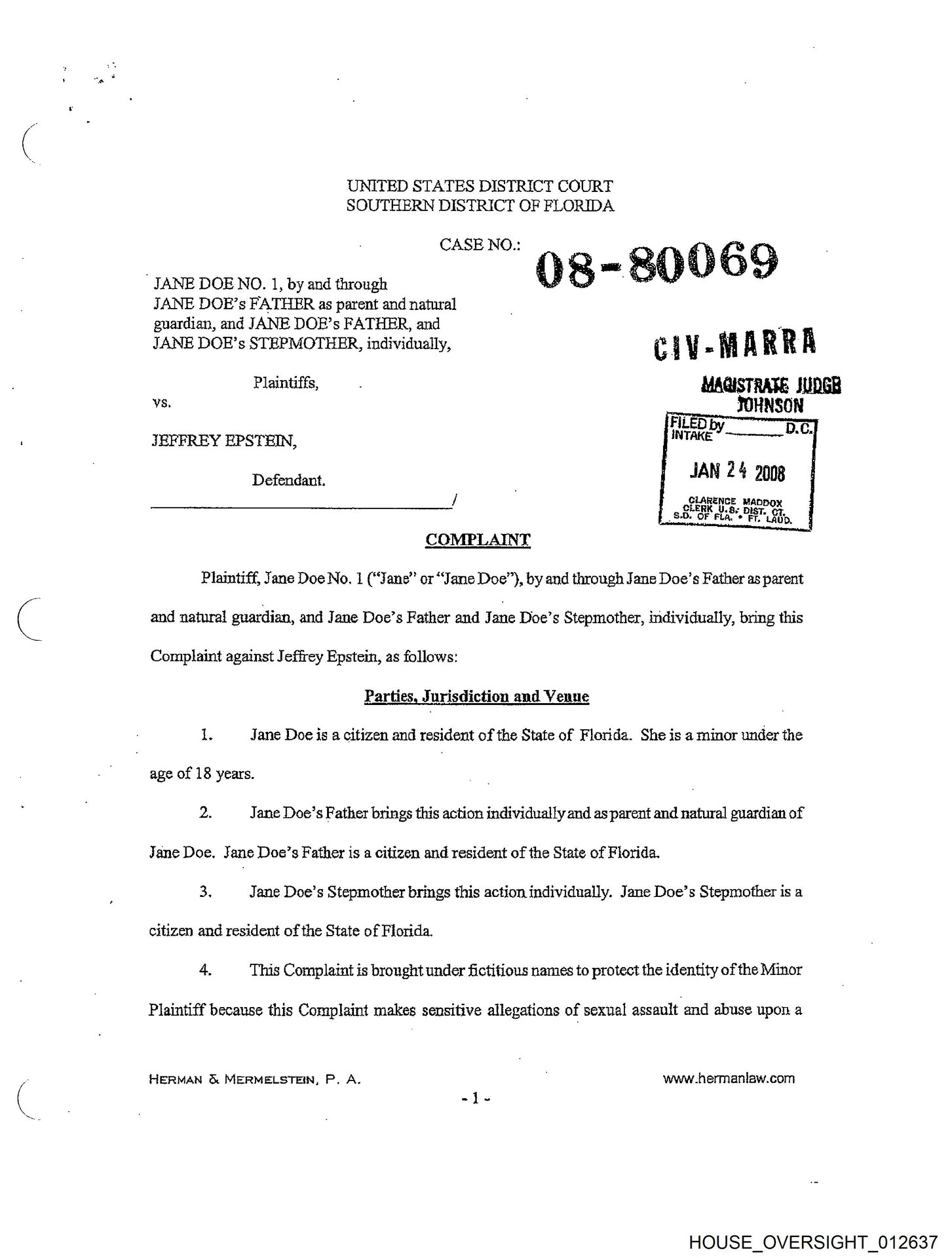 - HOUSE_OVERSIGHT_010584… L.M. v. Epstein, (Exhibit “V”). 47. Jane Doe’s federal complaint indicated that she sought damages of more than $50,000,000. Listing the …