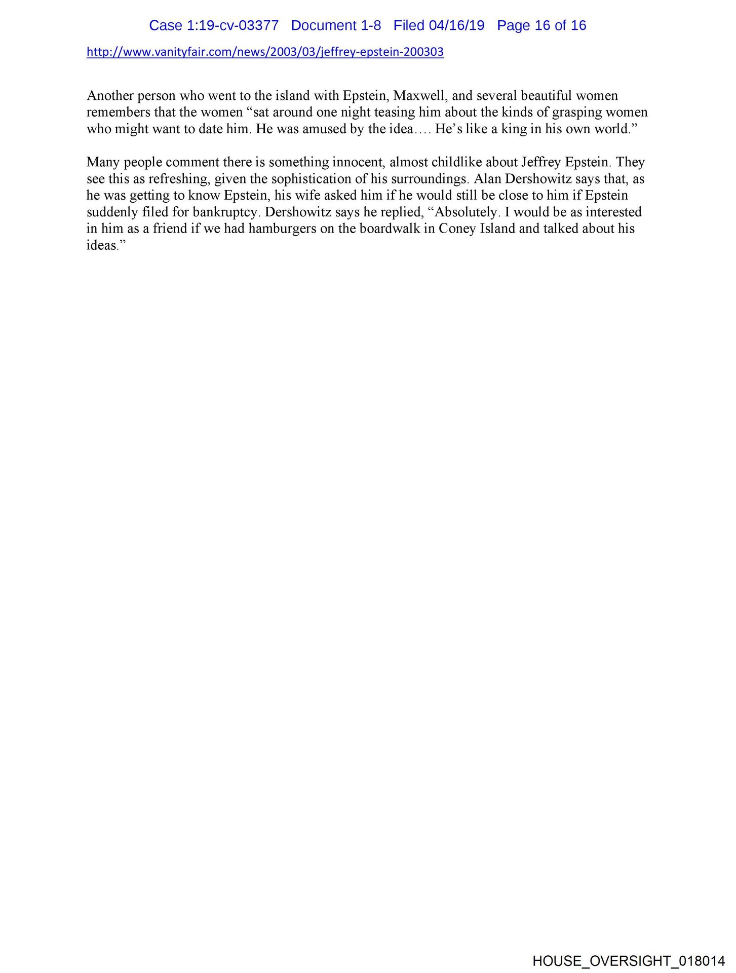- HOUSE_OVERSIGHT_010497… first. But in 2008, the fund Dershowitz had a a invested in lost a substantial amount. Afterward, according to a for- …