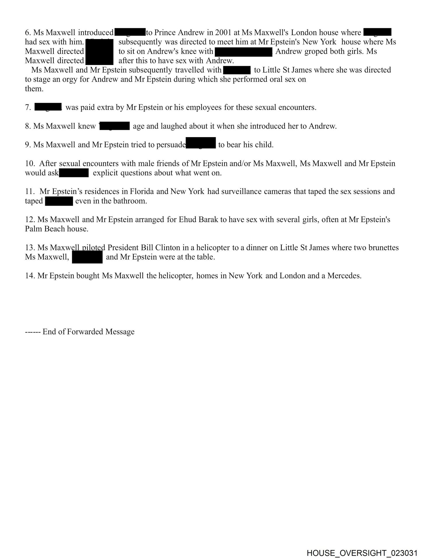 - HOUSE_OVERSIGHT_030590… Maxwell's London house where had sex with him. subsequently was directed to meet him at Mr Epstein's New York house where …